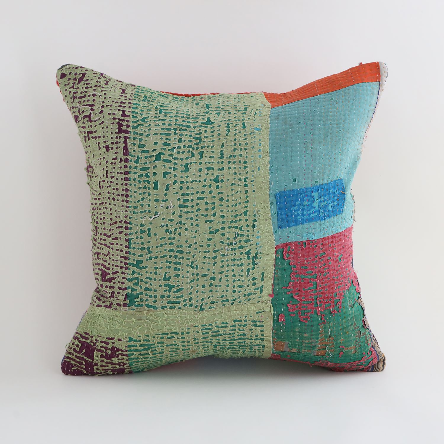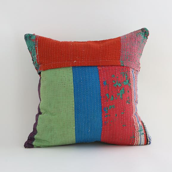 ラリーキルトを使ったクッションカバーです。ラリーキルトは、インド・パキスタンなどの中東アジアで、永い間受け継がれてきた伝統的な布です。古くなったサリーやデュパタ、腰布・古いハギレ等を貼り合わせてパッチワークし、丁寧に刺し子で合わせたもの。インダス河流域の遊牧民の家々では、嫁入り道具として母親から娘へ受け継がれています。気の遠くなるような作業を経て、わが子へ想いをこめて手渡します。一枚一枚に物語があって、何千年にも渡り母から娘へと伝えられる品。布の貼り合わせ方、刺し子の細やかさ、生地の厚みや柄など1つとして同じものはありません。丁寧にハンドメイドで作られているからこその味わいと魅力があります。