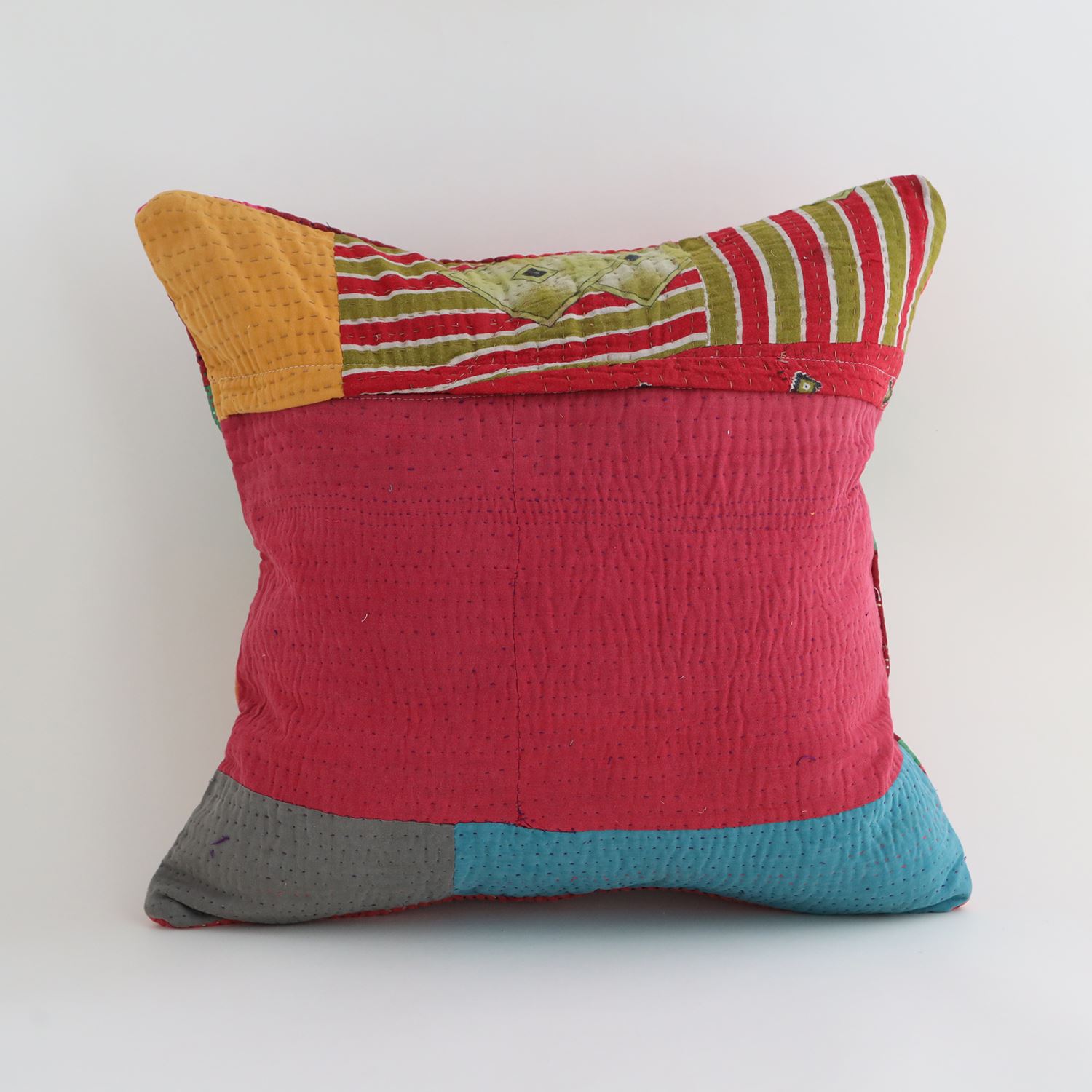 ラリーキルトを使ったクッションカバーです。ラリーキルトは、インド・パキスタンなどの中東アジアで、永い間受け継がれてきた伝統的な布です。古くなったサリーやデュパタ、腰布・古いハギレ等を貼り合わせてパッチワークし、丁寧に刺し子で合わせたもの。インダス河流域の遊牧民の家々では、嫁入り道具として母親から娘へ受け継がれています。気の遠くなるような作業を経て、わが子へ想いをこめて手渡します。一枚一枚に物語があって、何千年にも渡り母から娘へと伝えられる品。布の貼り合わせ方、刺し子の細やかさ、生地の厚みや柄など1つとして同じものはありません。丁寧にハンドメイドで作られているからこその味わいと魅力があります。
