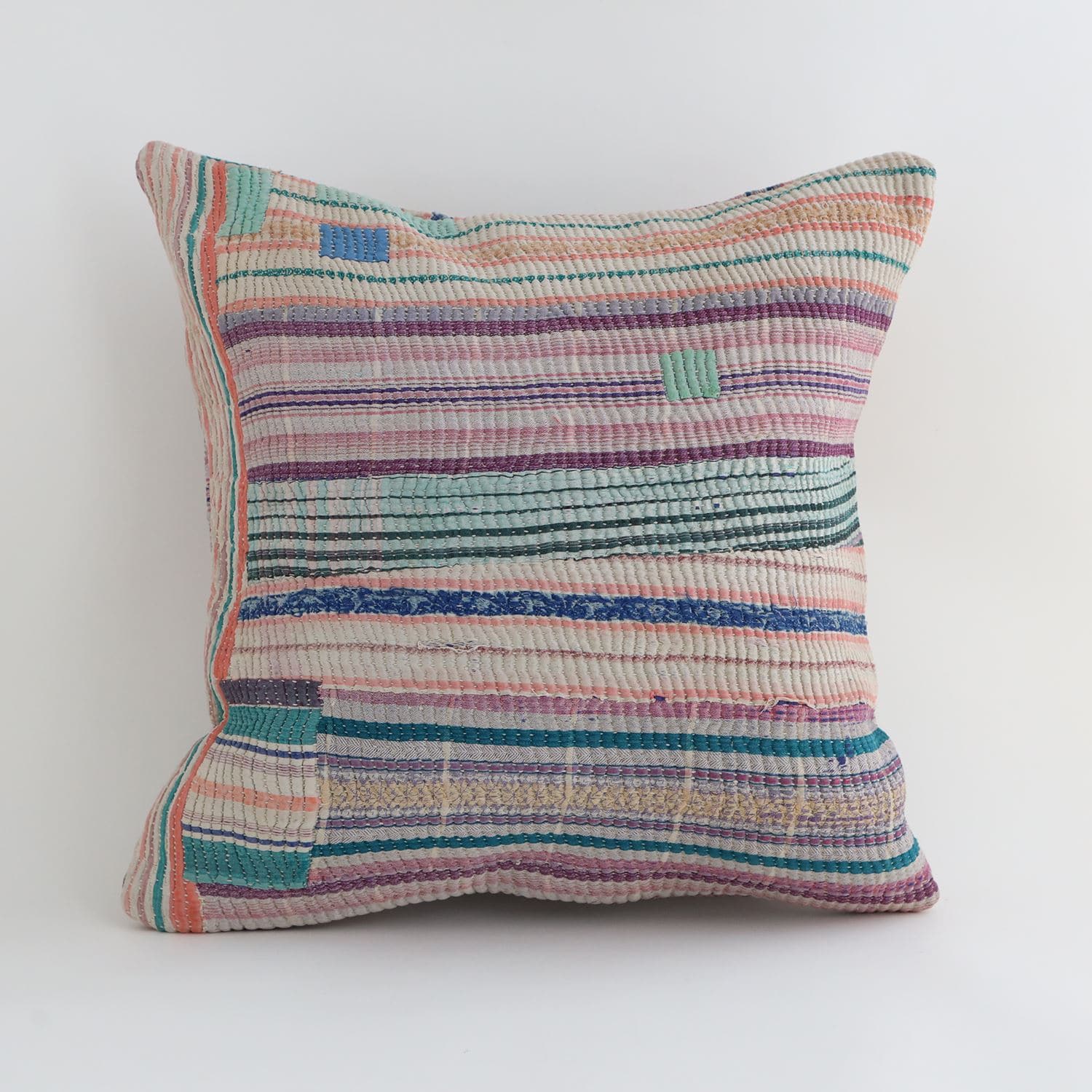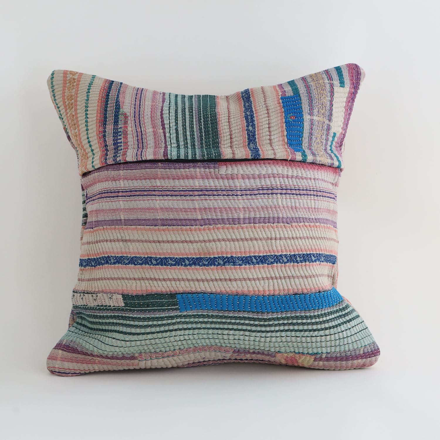 ラリーキルトを使ったクッションカバーです。ラリーキルトは、インド・パキスタンなどの中東アジアで、永い間受け継がれてきた伝統的な布です。古くなったサリーやデュパタ、腰布・古いハギレ等を貼り合わせてパッチワークし、丁寧に刺し子で合わせたもの。インダス河流域の遊牧民の家々では、嫁入り道具として母親から娘へ受け継がれています。気の遠くなるような作業を経て、わが子へ想いをこめて手渡します。一枚一枚に物語があって、何千年にも渡り母から娘へと伝えられる品。布の貼り合わせ方、刺し子の細やかさ、生地の厚みや柄など1つとして同じものはありません。丁寧にハンドメイドで作られているからこその味わいと魅力があります。
