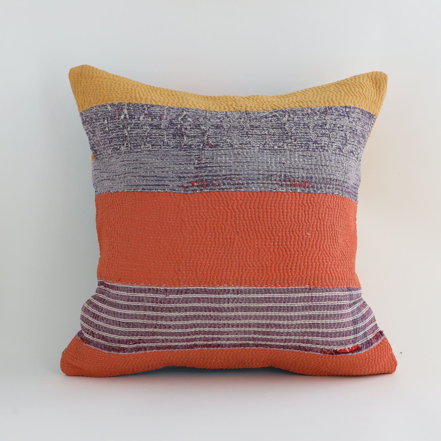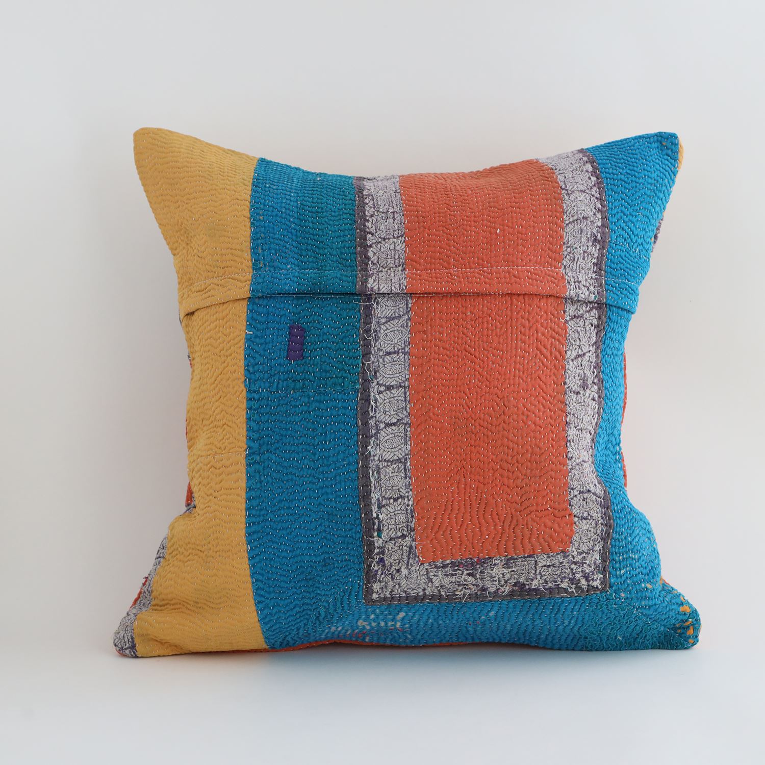ラリーキルトを使ったクッションカバーです。ラリーキルトは、インド・パキスタンなどの中東アジアで、永い間受け継がれてきた伝統的な布です。古くなったサリーやデュパタ、腰布・古いハギレ等を貼り合わせてパッチワークし、丁寧に刺し子で合わせたもの。インダス河流域の遊牧民の家々では、嫁入り道具として母親から娘へ受け継がれています。気の遠くなるような作業を経て、わが子へ想いをこめて手渡します。一枚一枚に物語があって、何千年にも渡り母から娘へと伝えられる品。布の貼り合わせ方、刺し子の細やかさ、生地の厚みや柄など1つとして同じものはありません。丁寧にハンドメイドで作られているからこその味わいと魅力があります。