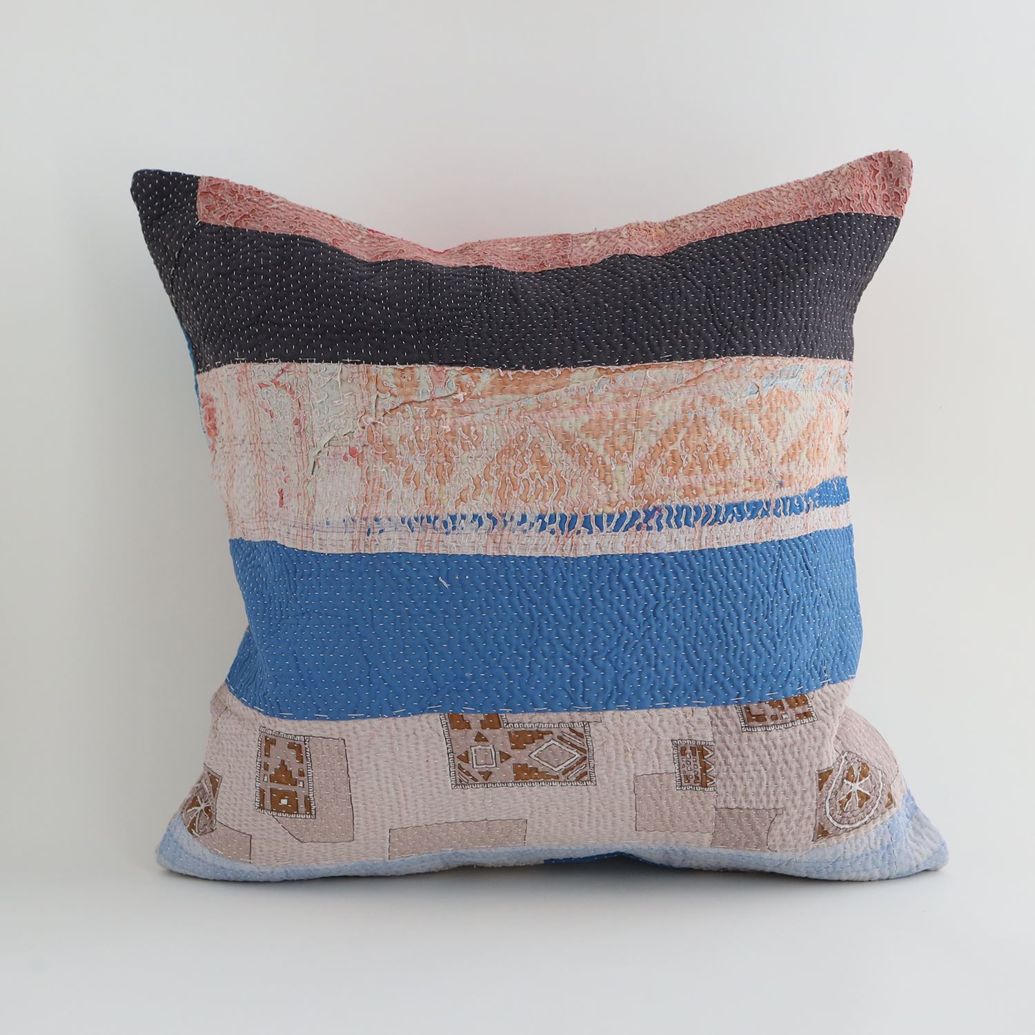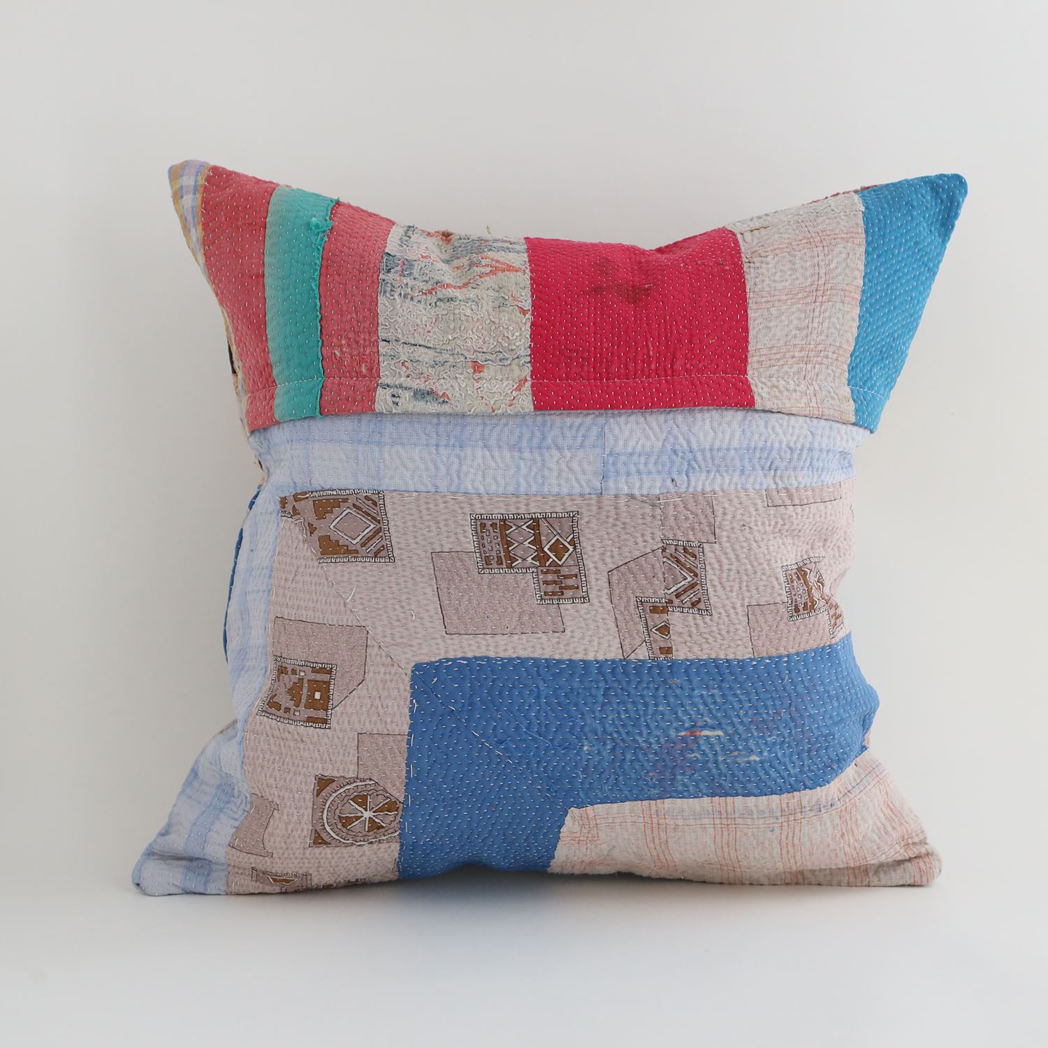 ラリーキルトを使ったクッションカバーです。ラリーキルトは、インド・パキスタンなどの中東アジアで、永い間受け継がれてきた伝統的な布です。古くなったサリーやデュパタ、腰布・古いハギレ等を貼り合わせてパッチワークし、丁寧に刺し子で合わせたもの。インダス河流域の遊牧民の家々では、嫁入り道具として母親から娘へ受け継がれています。気の遠くなるような作業を経て、わが子へ想いをこめて手渡します。一枚一枚に物語があって、何千年にも渡り母から娘へと伝えられる品。布の貼り合わせ方、刺し子の細やかさ、生地の厚みや柄など1つとして同じものはありません。丁寧にハンドメイドで作られているからこその味わいと魅力があります。