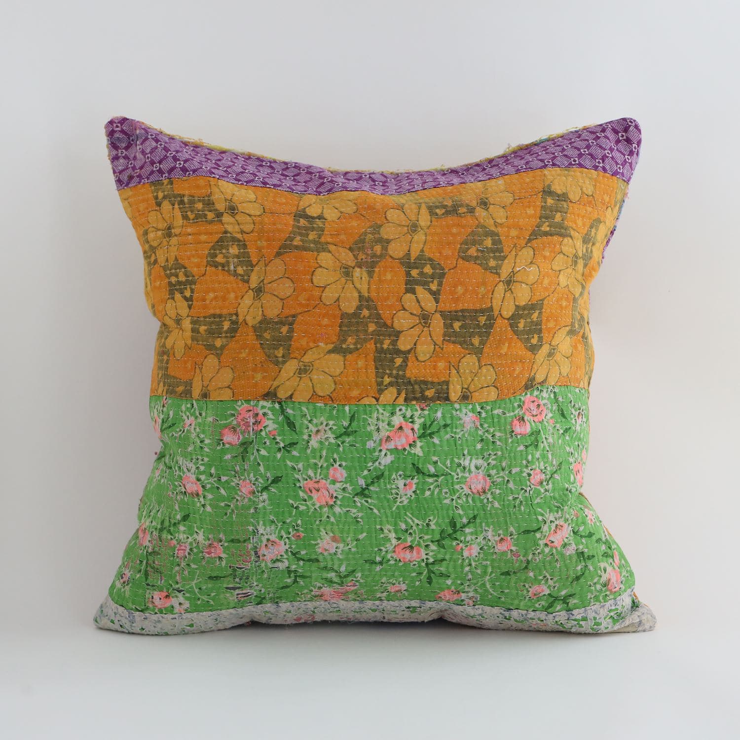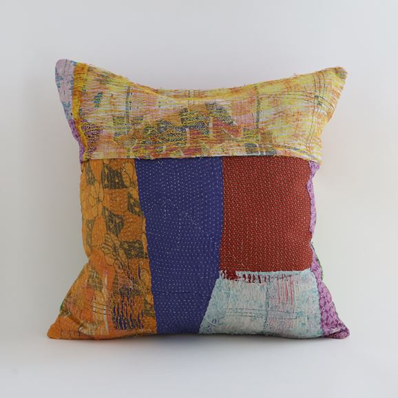 ラリーキルトを使ったクッションカバーです。ラリーキルトは、インド・パキスタンなどの中東アジアで、永い間受け継がれてきた伝統的な布です。古くなったサリーやデュパタ、腰布・古いハギレ等を貼り合わせてパッチワークし、丁寧に刺し子で合わせたもの。インダス河流域の遊牧民の家々では、嫁入り道具として母親から娘へ受け継がれています。気の遠くなるような作業を経て、わが子へ想いをこめて手渡します。一枚一枚に物語があって、何千年にも渡り母から娘へと伝えられる品。布の貼り合わせ方、刺し子の細やかさ、生地の厚みや柄など1つとして同じものはありません。丁寧にハンドメイドで作られているからこその味わいと魅力があります。