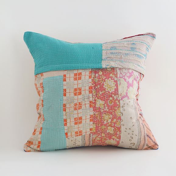 ラリーキルトを使ったクッションカバーです。ラリーキルトは、インド・パキスタンなどの中東アジアで、永い間受け継がれてきた伝統的な布です。古くなったサリーやデュパタ、腰布・古いハギレ等を貼り合わせてパッチワークし、丁寧に刺し子で合わせたもの。インダス河流域の遊牧民の家々では、嫁入り道具として母親から娘へ受け継がれています。気の遠くなるような作業を経て、わが子へ想いをこめて手渡します。一枚一枚に物語があって、何千年にも渡り母から娘へと伝えられる品。布の貼り合わせ方、刺し子の細やかさ、生地の厚みや柄など1つとして同じものはありません。丁寧にハンドメイドで作られているからこその味わいと魅力があります。