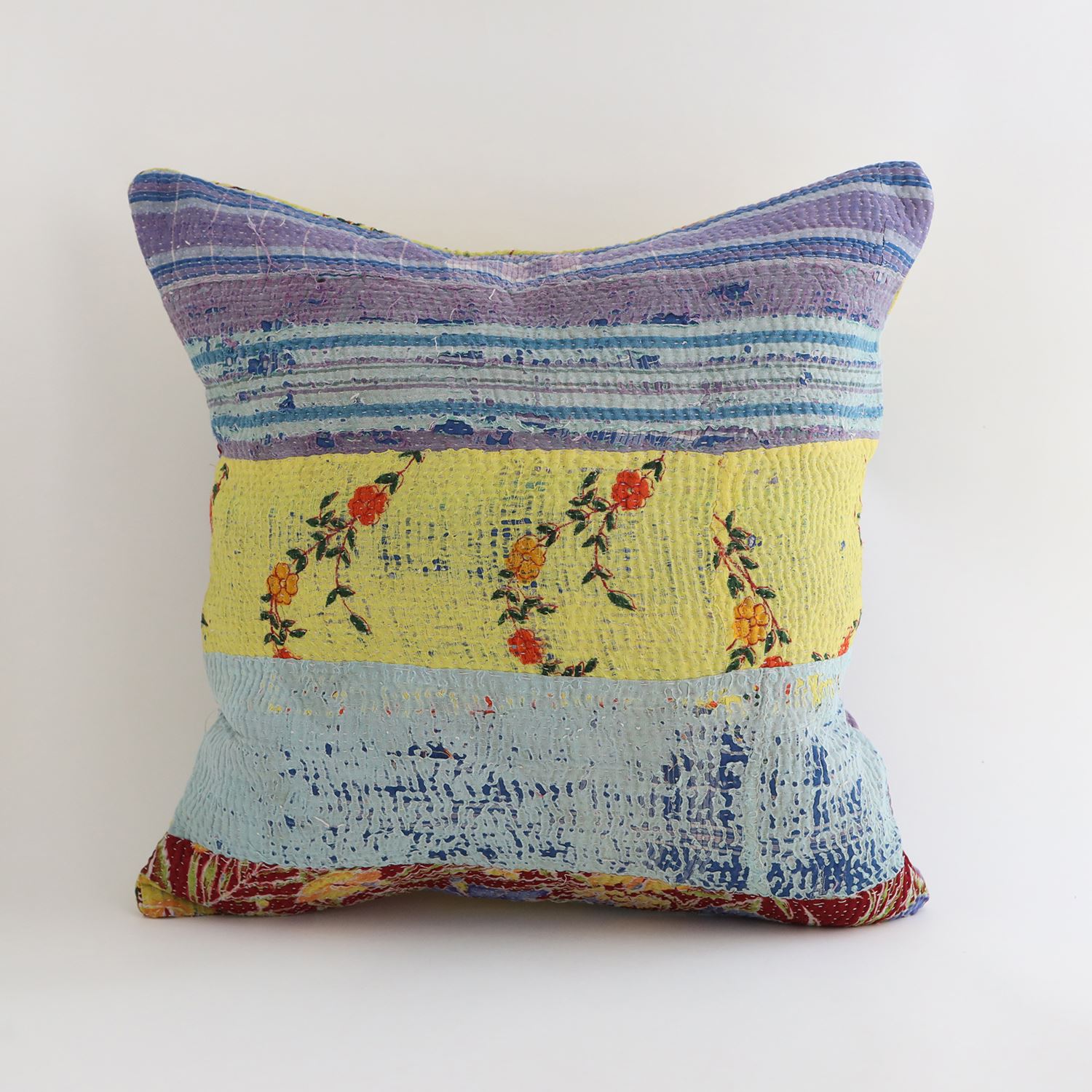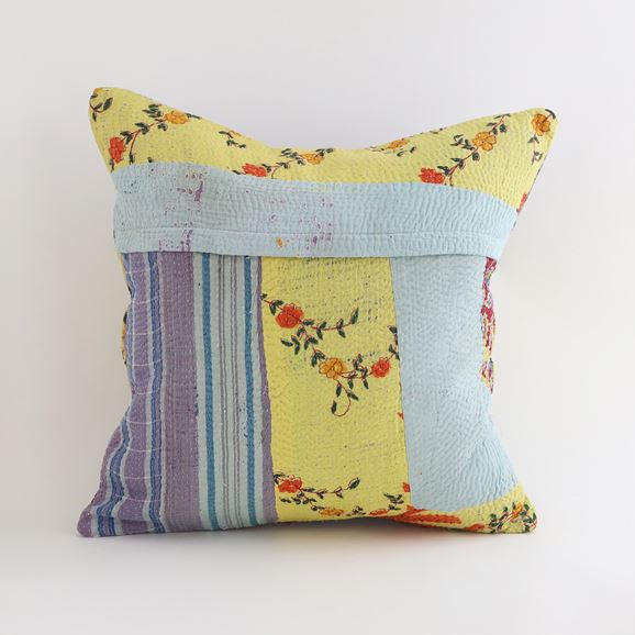 ラリーキルトを使ったクッションカバーです。ラリーキルトは、インド・パキスタンなどの中東アジアで、永い間受け継がれてきた伝統的な布です。古くなったサリーやデュパタ、腰布・古いハギレ等を貼り合わせてパッチワークし、丁寧に刺し子で合わせたもの。インダス河流域の遊牧民の家々では、嫁入り道具として母親から娘へ受け継がれています。気の遠くなるような作業を経て、わが子へ想いをこめて手渡します。一枚一枚に物語があって、何千年にも渡り母から娘へと伝えられる品。布の貼り合わせ方、刺し子の細やかさ、生地の厚みや柄など1つとして同じものはありません。丁寧にハンドメイドで作られているからこその味わいと魅力があります。