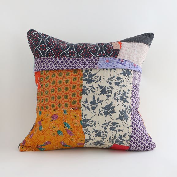 ラリーキルトを使ったクッションカバーです。ラリーキルトは、インド・パキスタンなどの中東アジアで、永い間受け継がれてきた伝統的な布です。古くなったサリーやデュパタ、腰布・古いハギレ等を貼り合わせてパッチワークし、丁寧に刺し子で合わせたもの。インダス河流域の遊牧民の家々では、嫁入り道具として母親から娘へ受け継がれています。気の遠くなるような作業を経て、わが子へ想いをこめて手渡します。一枚一枚に物語があって、何千年にも渡り母から娘へと伝えられる品。布の貼り合わせ方、刺し子の細やかさ、生地の厚みや柄など1つとして同じものはありません。丁寧にハンドメイドで作られているからこその味わいと魅力があります。