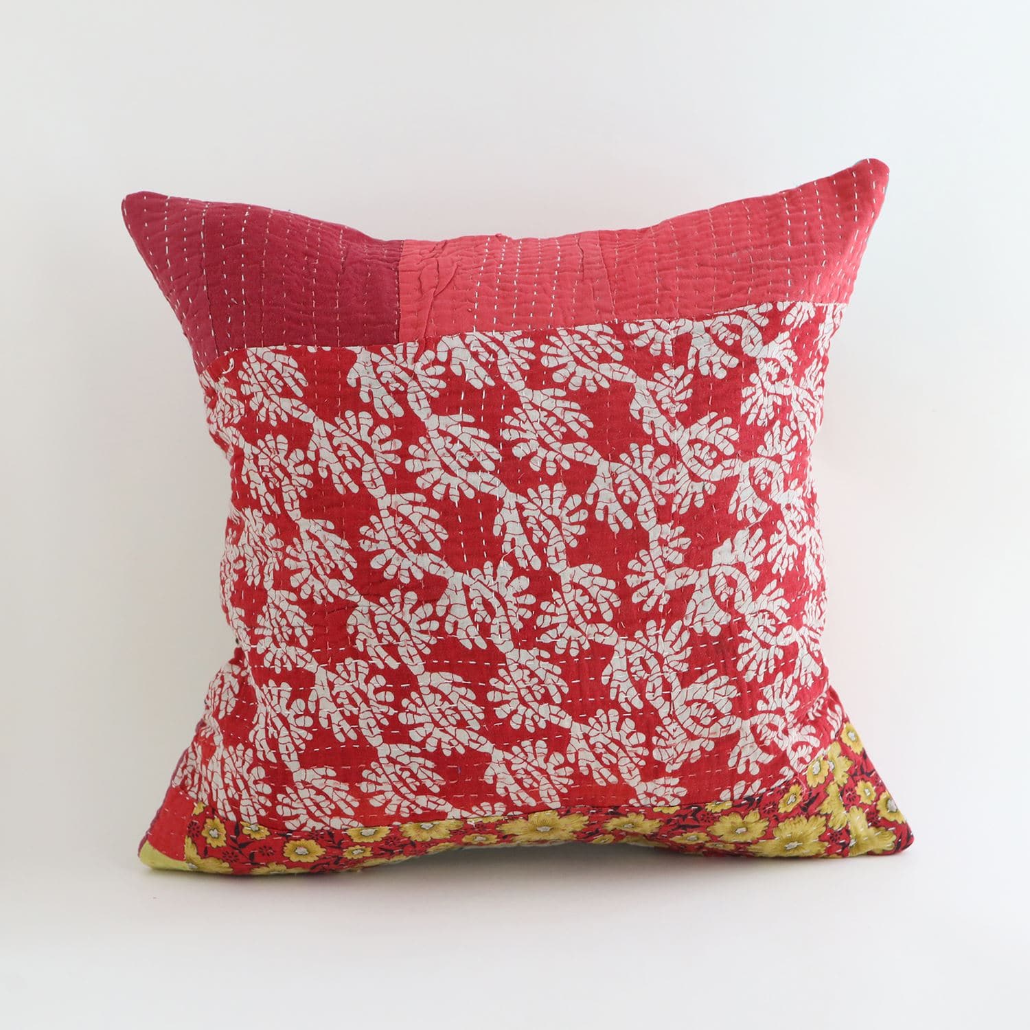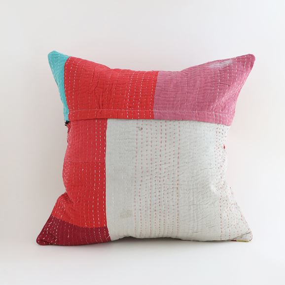 ラリーキルトを使ったクッションカバーです。ラリーキルトは、インド・パキスタンなどの中東アジアで、永い間受け継がれてきた伝統的な布です。古くなったサリーやデュパタ、腰布・古いハギレ等を貼り合わせてパッチワークし、丁寧に刺し子で合わせたもの。インダス河流域の遊牧民の家々では、嫁入り道具として母親から娘へ受け継がれています。気の遠くなるような作業を経て、わが子へ想いをこめて手渡します。一枚一枚に物語があって、何千年にも渡り母から娘へと伝えられる品。布の貼り合わせ方、刺し子の細やかさ、生地の厚みや柄など1つとして同じものはありません。丁寧にハンドメイドで作られているからこその味わいと魅力があります。