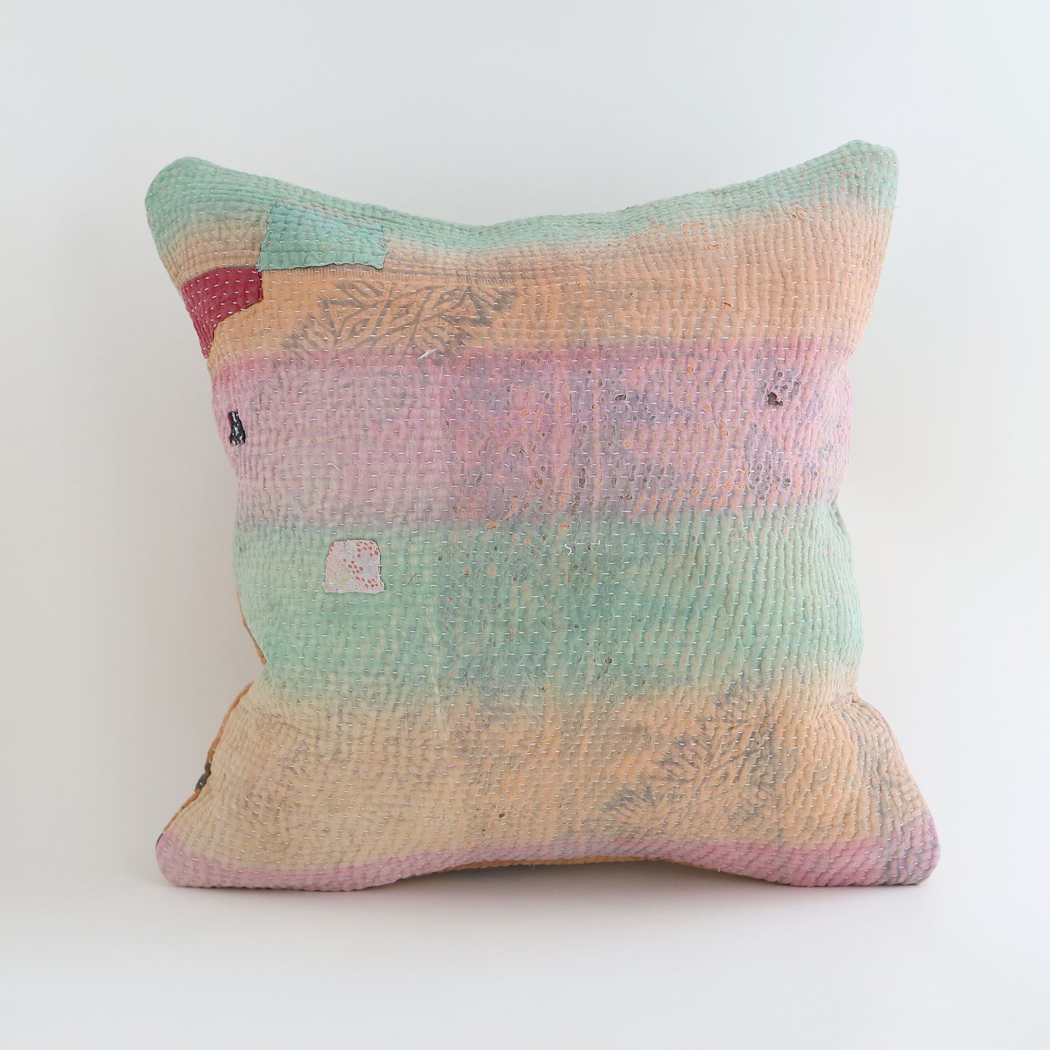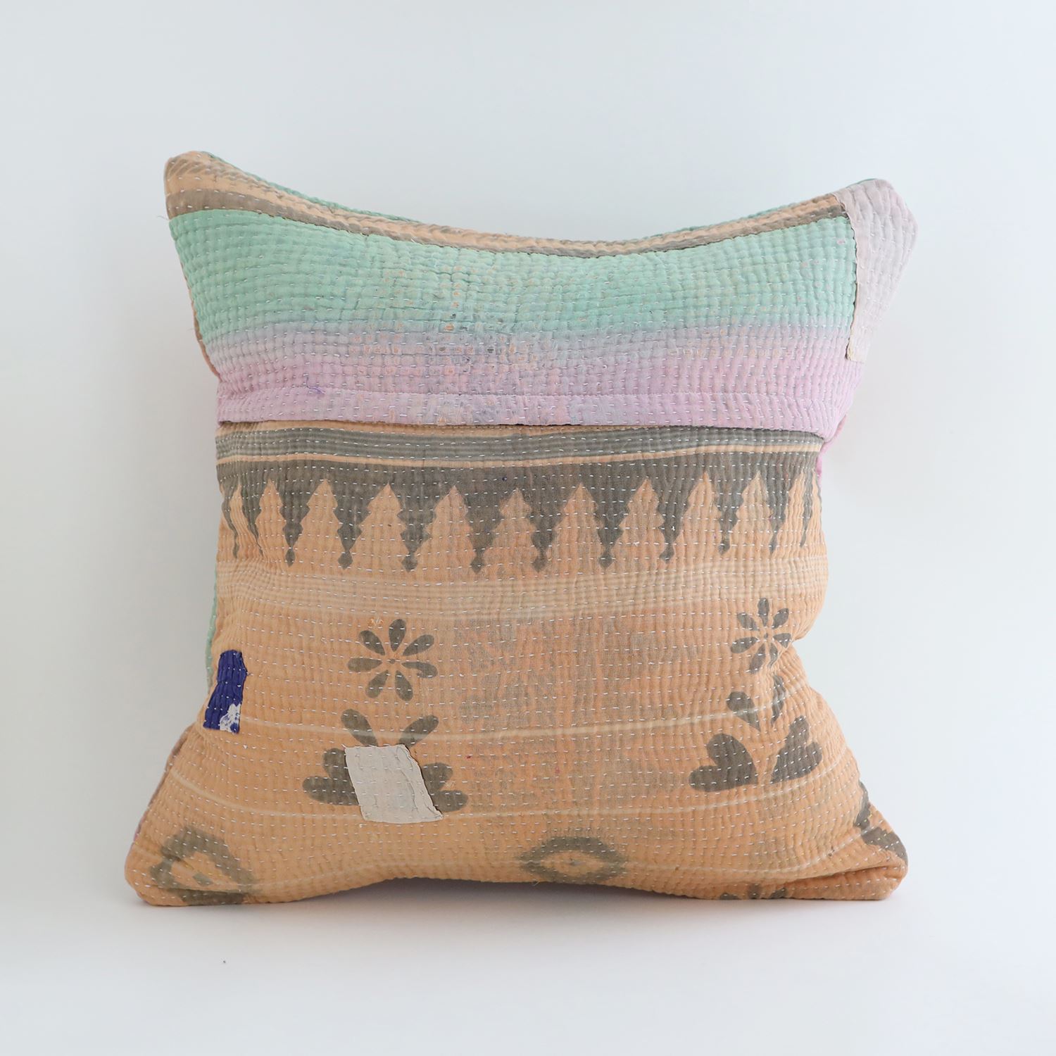 ラリーキルトを使ったクッションカバーです。ラリーキルトは、インド・パキスタンなどの中東アジアで、永い間受け継がれてきた伝統的な布です。古くなったサリーやデュパタ、腰布・古いハギレ等を貼り合わせてパッチワークし、丁寧に刺し子で合わせたもの。インダス河流域の遊牧民の家々では、嫁入り道具として母親から娘へ受け継がれています。気の遠くなるような作業を経て、わが子へ想いをこめて手渡します。一枚一枚に物語があって、何千年にも渡り母から娘へと伝えられる品。布の貼り合わせ方、刺し子の細やかさ、生地の厚みや柄など1つとして同じものはありません。丁寧にハンドメイドで作られているからこその味わいと魅力があります。