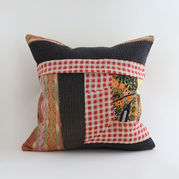 ラリーキルトを使ったクッションカバーです。ラリーキルトは、インド・パキスタンなどの中東アジアで、永い間受け継がれてきた伝統的な布です。古くなったサリーやデュパタ、腰布・古いハギレ等を貼り合わせてパッチワークし、丁寧に刺し子で合わせたもの。インダス河流域の遊牧民の家々では、嫁入り道具として母親から娘へ受け継がれています。気の遠くなるような作業を経て、わが子へ想いをこめて手渡します。一枚一枚に物語があって、何千年にも渡り母から娘へと伝えられる品。布の貼り合わせ方、刺し子の細やかさ、生地の厚みや柄など1つとして同じものはありません。丁寧にハンドメイドで作られているからこその味わいと魅力があります。