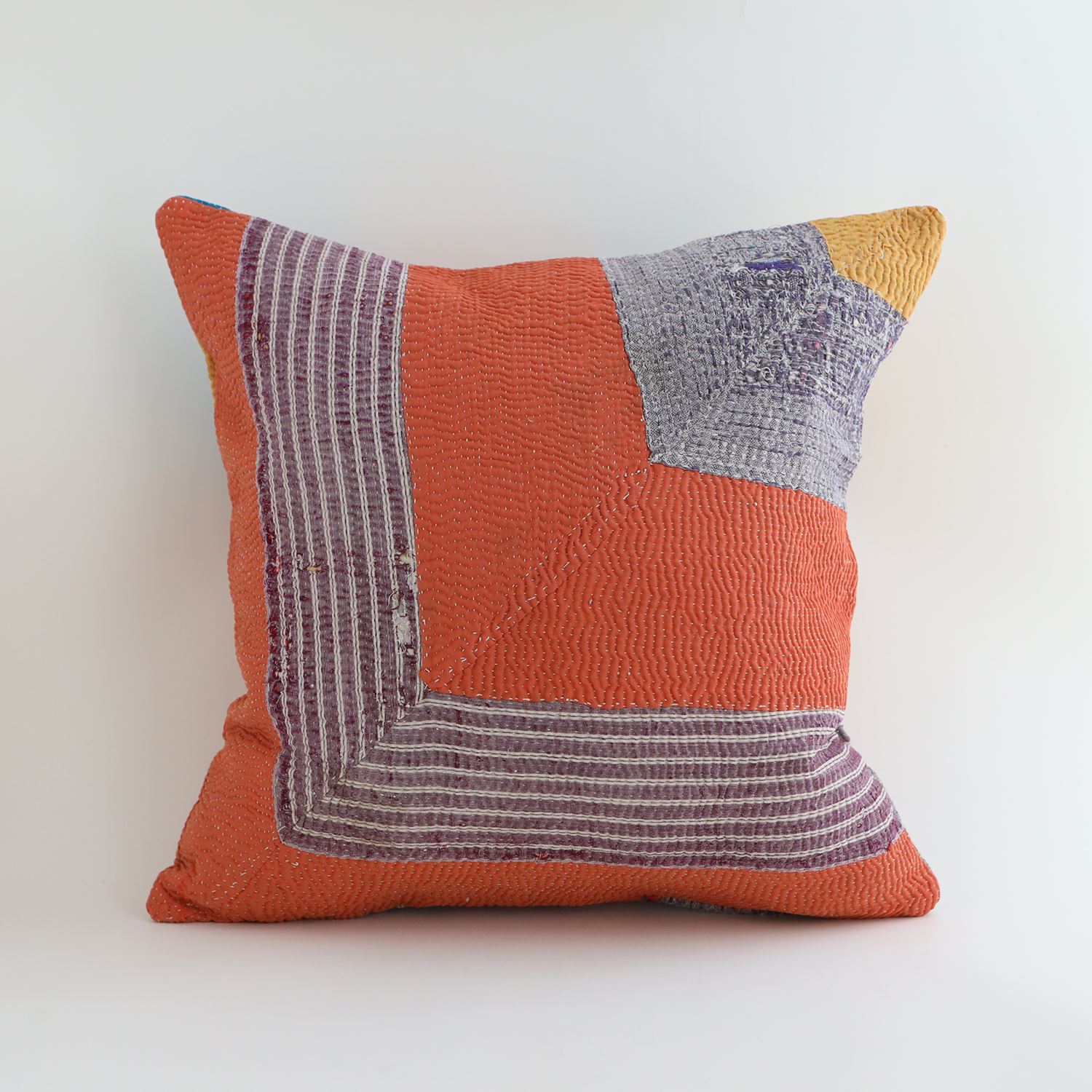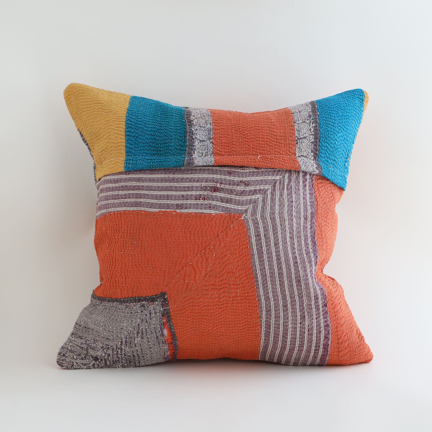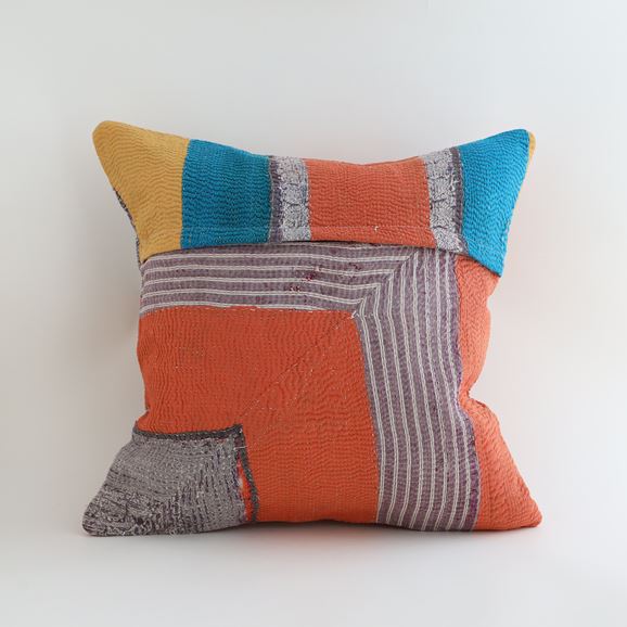 ラリーキルトを使ったクッションカバーです。ラリーキルトは、インド・パキスタンなどの中東アジアで、永い間受け継がれてきた伝統的な布です。古くなったサリーやデュパタ、腰布・古いハギレ等を貼り合わせてパッチワークし、丁寧に刺し子で合わせたもの。インダス河流域の遊牧民の家々では、嫁入り道具として母親から娘へ受け継がれています。気の遠くなるような作業を経て、わが子へ想いをこめて手渡します。一枚一枚に物語があって、何千年にも渡り母から娘へと伝えられる品。布の貼り合わせ方、刺し子の細やかさ、生地の厚みや柄など1つとして同じものはありません。丁寧にハンドメイドで作られているからこその味わいと魅力があります。