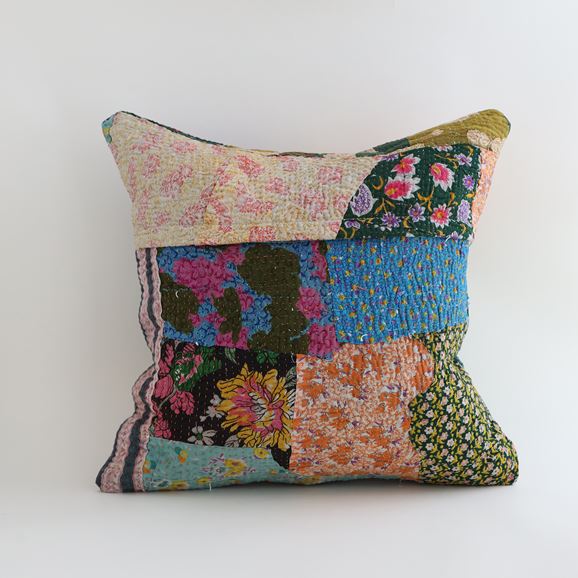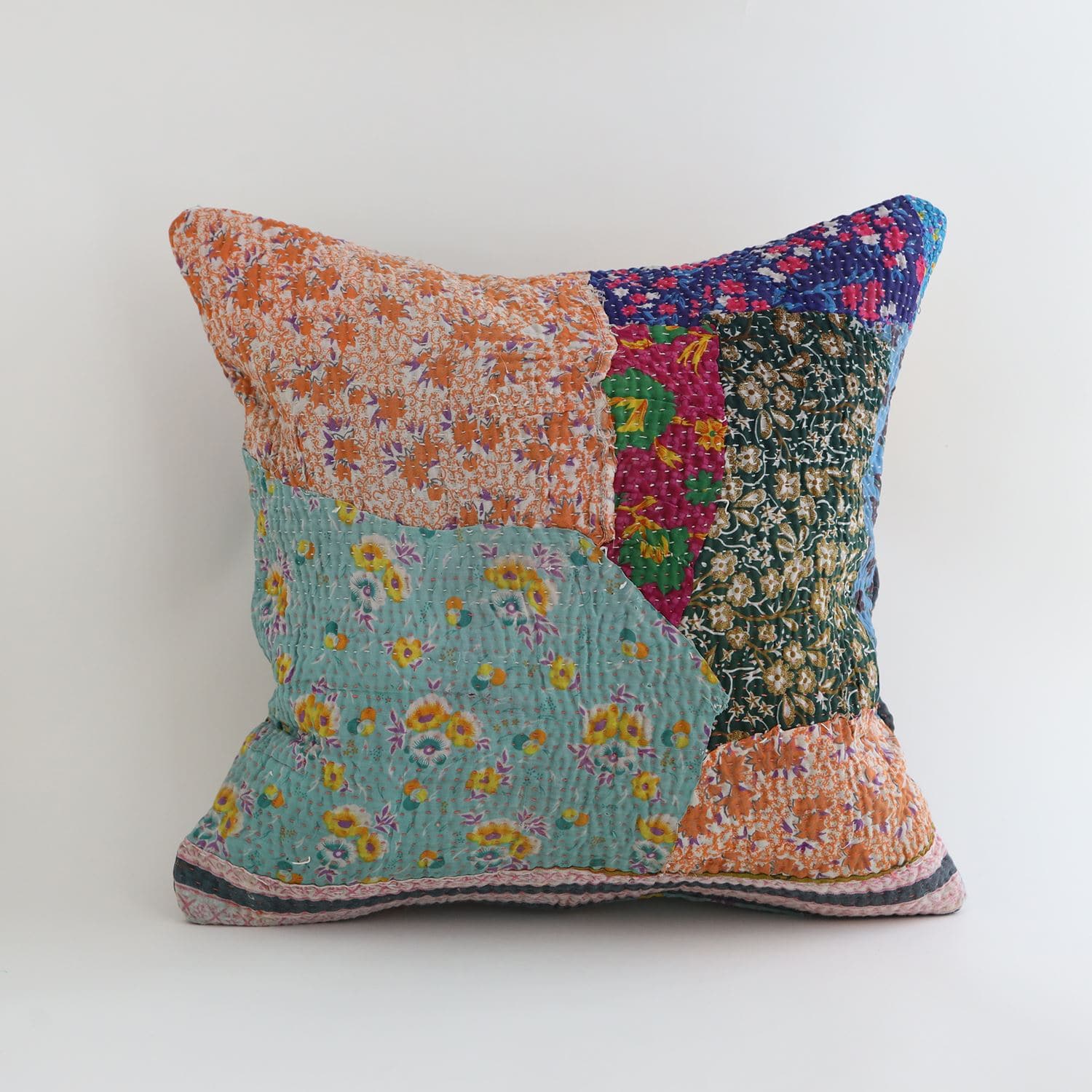 ラリーキルトを使ったクッションカバーです。ラリーキルトは、インド・パキスタンなどの中東アジアで、永い間受け継がれてきた伝統的な布です。古くなったサリーやデュパタ、腰布・古いハギレ等を貼り合わせてパッチワークし、丁寧に刺し子で合わせたもの。インダス河流域の遊牧民の家々では、嫁入り道具として母親から娘へ受け継がれています。気の遠くなるような作業を経て、わが子へ想いをこめて手渡します。一枚一枚に物語があって、何千年にも渡り母から娘へと伝えられる品。布の貼り合わせ方、刺し子の細やかさ、生地の厚みや柄など1つとして同じものはありません。丁寧にハンドメイドで作られているからこその味わいと魅力があります。