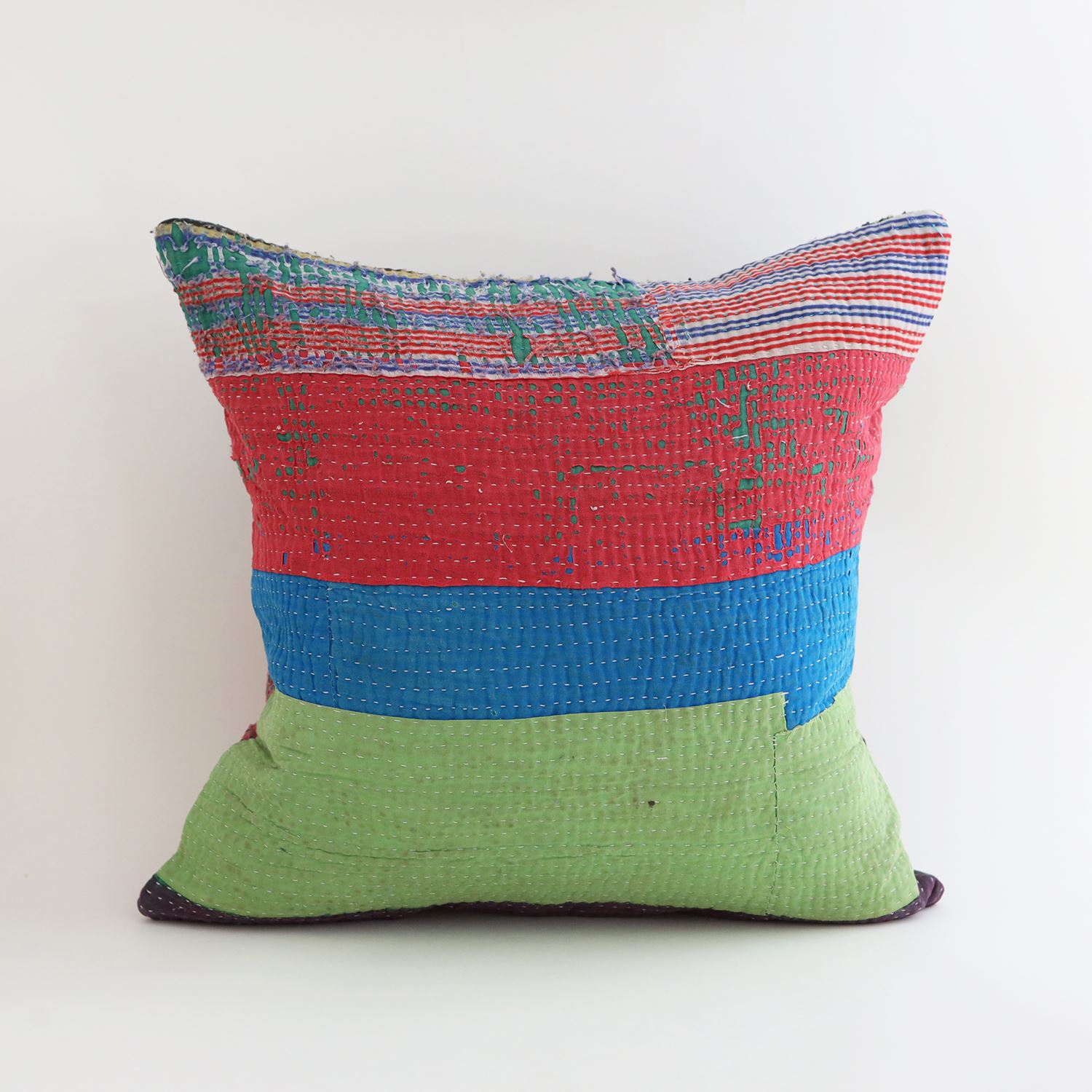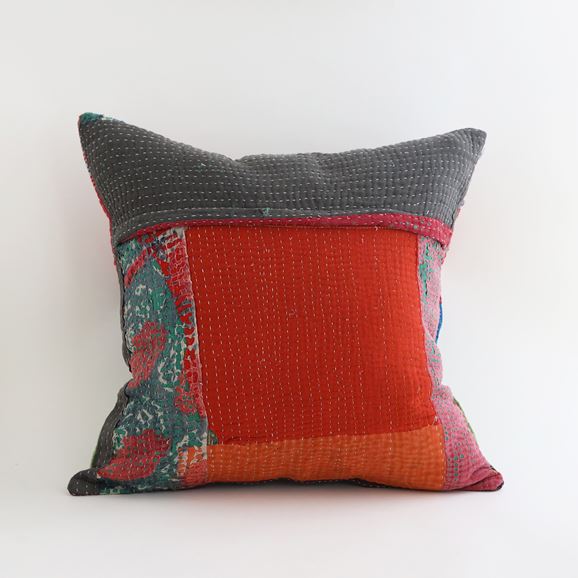ラリーキルトを使ったクッションカバーです。ラリーキルトは、インド・パキスタンなどの中東アジアで、永い間受け継がれてきた伝統的な布です。古くなったサリーやデュパタ、腰布・古いハギレ等を貼り合わせてパッチワークし、丁寧に刺し子で合わせたもの。インダス河流域の遊牧民の家々では、嫁入り道具として母親から娘へ受け継がれています。気の遠くなるような作業を経て、わが子へ想いをこめて手渡します。一枚一枚に物語があって、何千年にも渡り母から娘へと伝えられる品。布の貼り合わせ方、刺し子の細やかさ、生地の厚みや柄など1つとして同じものはありません。丁寧にハンドメイドで作られているからこその味わいと魅力があります。
