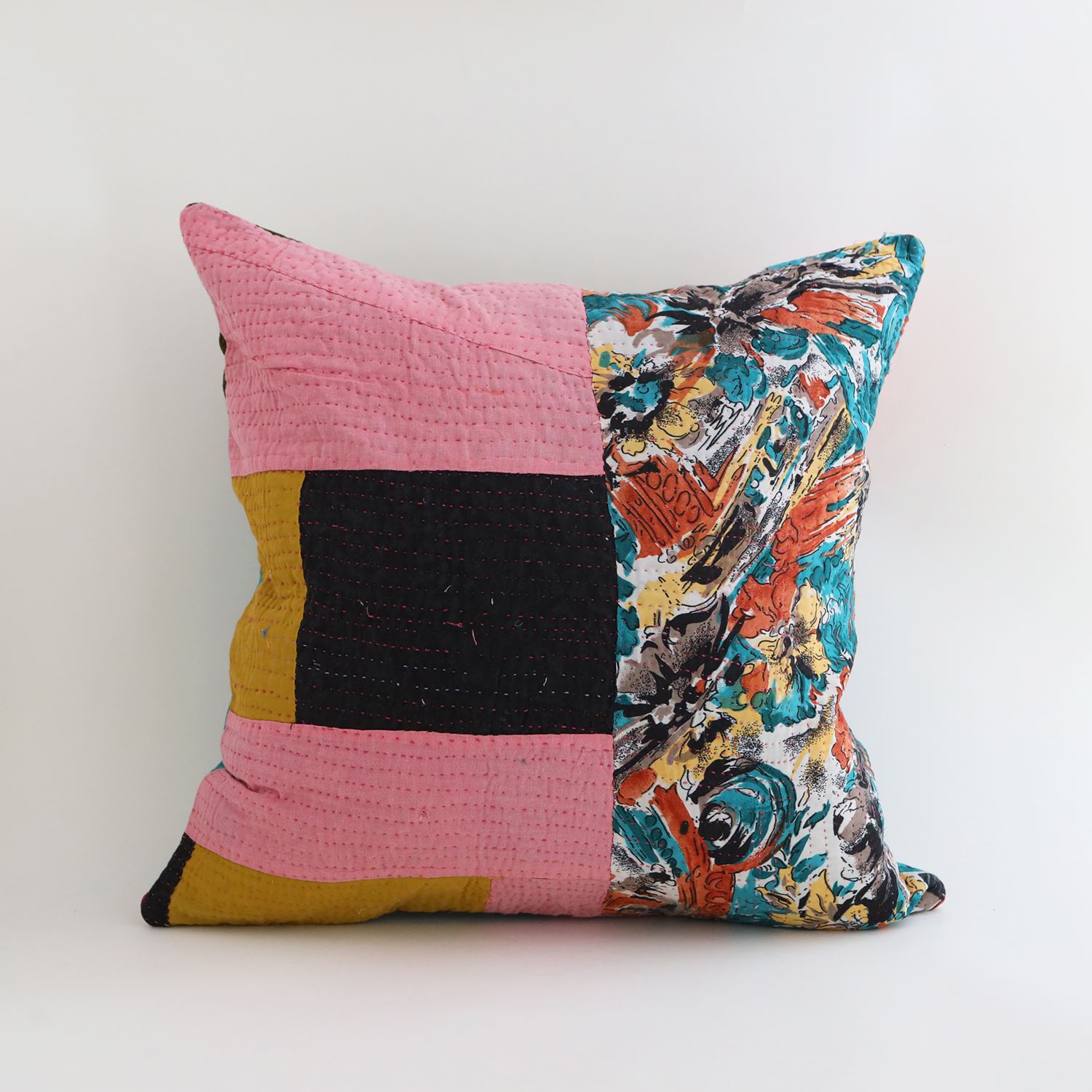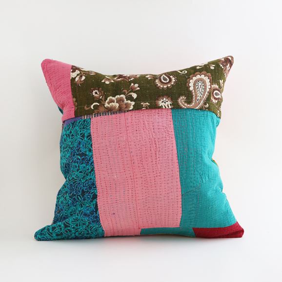 ラリーキルトを使ったクッションカバーです。ラリーキルトは、インド・パキスタンなどの中東アジアで、永い間受け継がれてきた伝統的な布です。古くなったサリーやデュパタ、腰布・古いハギレ等を貼り合わせてパッチワークし、丁寧に刺し子で合わせたもの。インダス河流域の遊牧民の家々では、嫁入り道具として母親から娘へ受け継がれています。気の遠くなるような作業を経て、わが子へ想いをこめて手渡します。一枚一枚に物語があって、何千年にも渡り母から娘へと伝えられる品。布の貼り合わせ方、刺し子の細やかさ、生地の厚みや柄など1つとして同じものはありません。丁寧にハンドメイドで作られているからこその味わいと魅力があります。