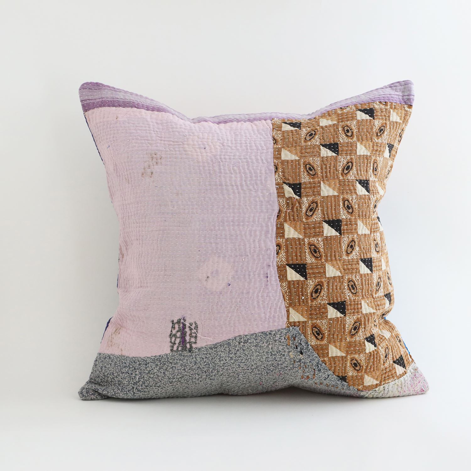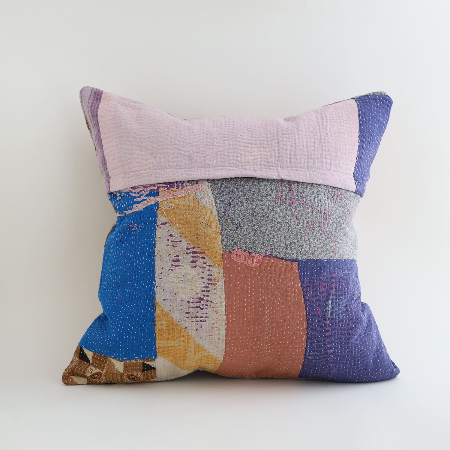 ラリーキルトを使ったクッションカバーです。ラリーキルトは、インド・パキスタンなどの中東アジアで、永い間受け継がれてきた伝統的な布です。古くなったサリーやデュパタ、腰布・古いハギレ等を貼り合わせてパッチワークし、丁寧に刺し子で合わせたもの。インダス河流域の遊牧民の家々では、嫁入り道具として母親から娘へ受け継がれています。気の遠くなるような作業を経て、わが子へ想いをこめて手渡します。一枚一枚に物語があって、何千年にも渡り母から娘へと伝えられる品。布の貼り合わせ方、刺し子の細やかさ、生地の厚みや柄など1つとして同じものはありません。丁寧にハンドメイドで作られているからこその味わいと魅力があります。