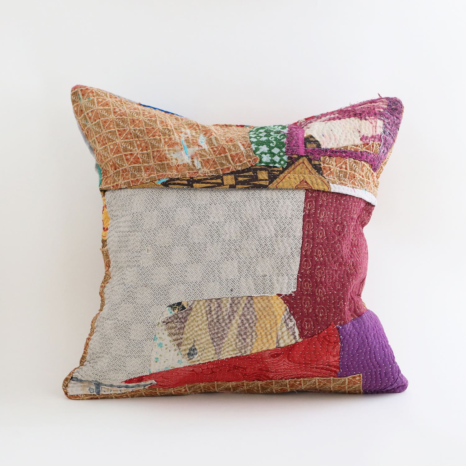 ラリーキルトを使ったクッションカバーです。ラリーキルトは、インド・パキスタンなどの中東アジアで、永い間受け継がれてきた伝統的な布です。古くなったサリーやデュパタ、腰布・古いハギレ等を貼り合わせてパッチワークし、丁寧に刺し子で合わせたもの。インダス河流域の遊牧民の家々では、嫁入り道具として母親から娘へ受け継がれています。気の遠くなるような作業を経て、わが子へ想いをこめて手渡します。一枚一枚に物語があって、何千年にも渡り母から娘へと伝えられる品。布の貼り合わせ方、刺し子の細やかさ、生地の厚みや柄など1つとして同じものはありません。丁寧にハンドメイドで作られているからこその味わいと魅力があります。