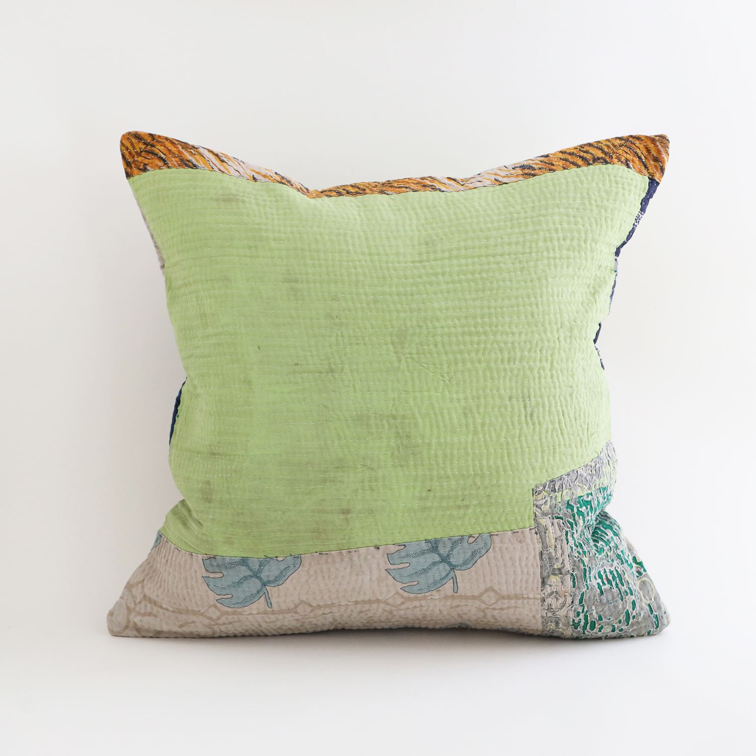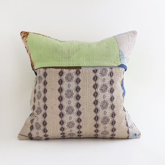 ラリーキルトを使ったクッションカバーです。ラリーキルトは、インド・パキスタンなどの中東アジアで、永い間受け継がれてきた伝統的な布です。古くなったサリーやデュパタ、腰布・古いハギレ等を貼り合わせてパッチワークし、丁寧に刺し子で合わせたもの。インダス河流域の遊牧民の家々では、嫁入り道具として母親から娘へ受け継がれています。気の遠くなるような作業を経て、わが子へ想いをこめて手渡します。一枚一枚に物語があって、何千年にも渡り母から娘へと伝えられる品。布の貼り合わせ方、刺し子の細やかさ、生地の厚みや柄など1つとして同じものはありません。丁寧にハンドメイドで作られているからこその味わいと魅力があります。