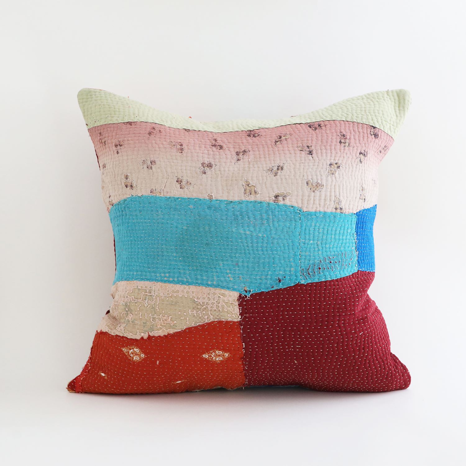 ラリーキルトを使ったクッションカバーです。ラリーキルトは、インド・パキスタンなどの中東アジアで、永い間受け継がれてきた伝統的な布です。古くなったサリーやデュパタ、腰布・古いハギレ等を貼り合わせてパッチワークし、丁寧に刺し子で合わせたもの。インダス河流域の遊牧民の家々では、嫁入り道具として母親から娘へ受け継がれています。気の遠くなるような作業を経て、わが子へ想いをこめて手渡します。一枚一枚に物語があって、何千年にも渡り母から娘へと伝えられる品。布の貼り合わせ方、刺し子の細やかさ、生地の厚みや柄など1つとして同じものはありません。丁寧にハンドメイドで作られているからこその味わいと魅力があります。