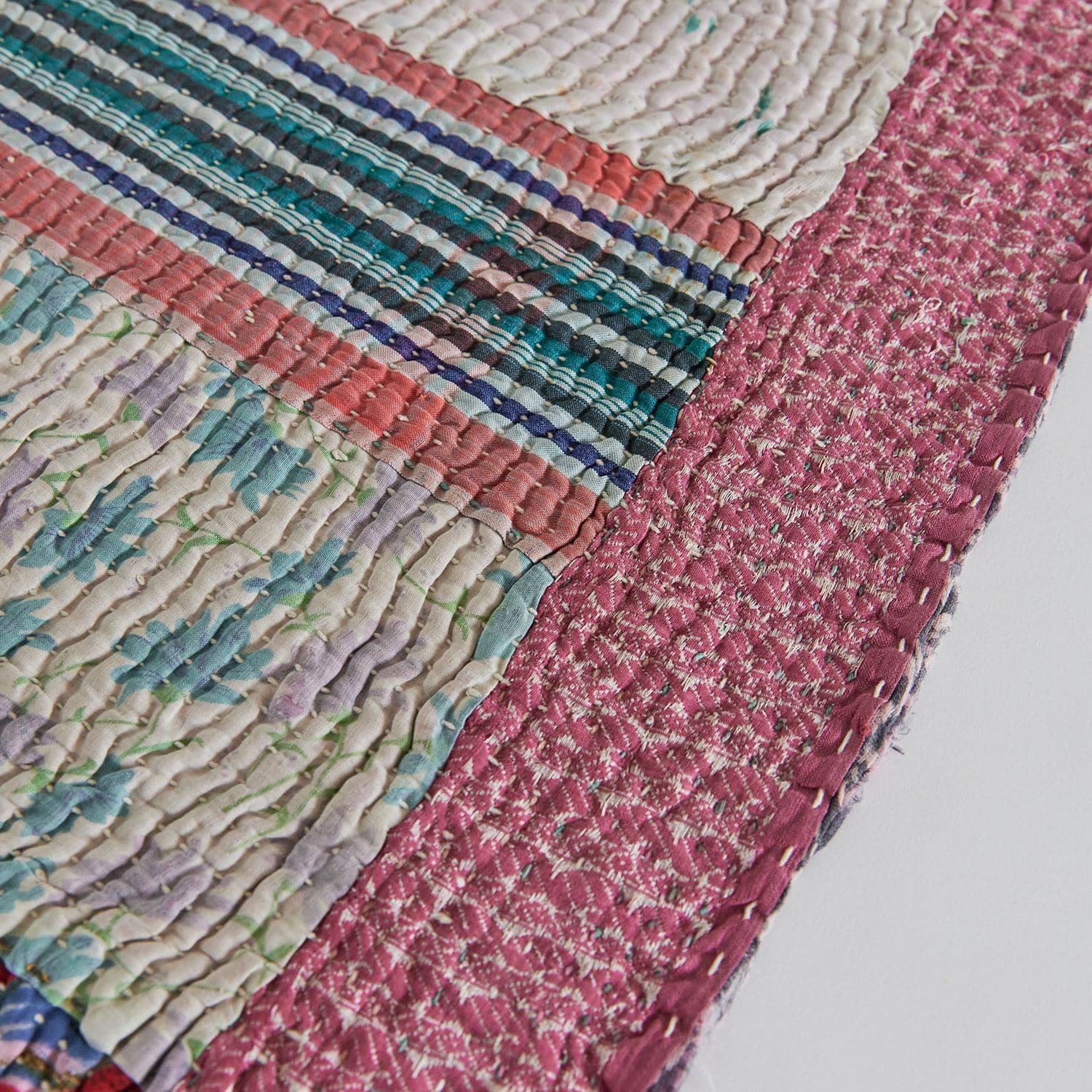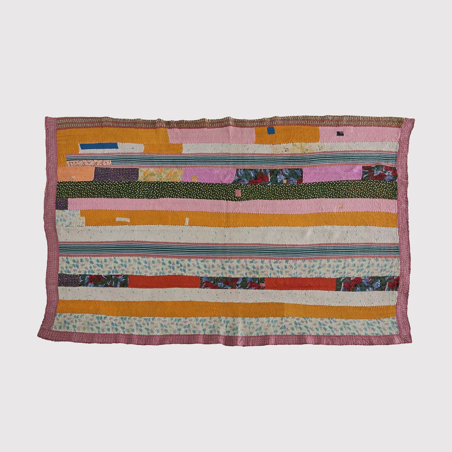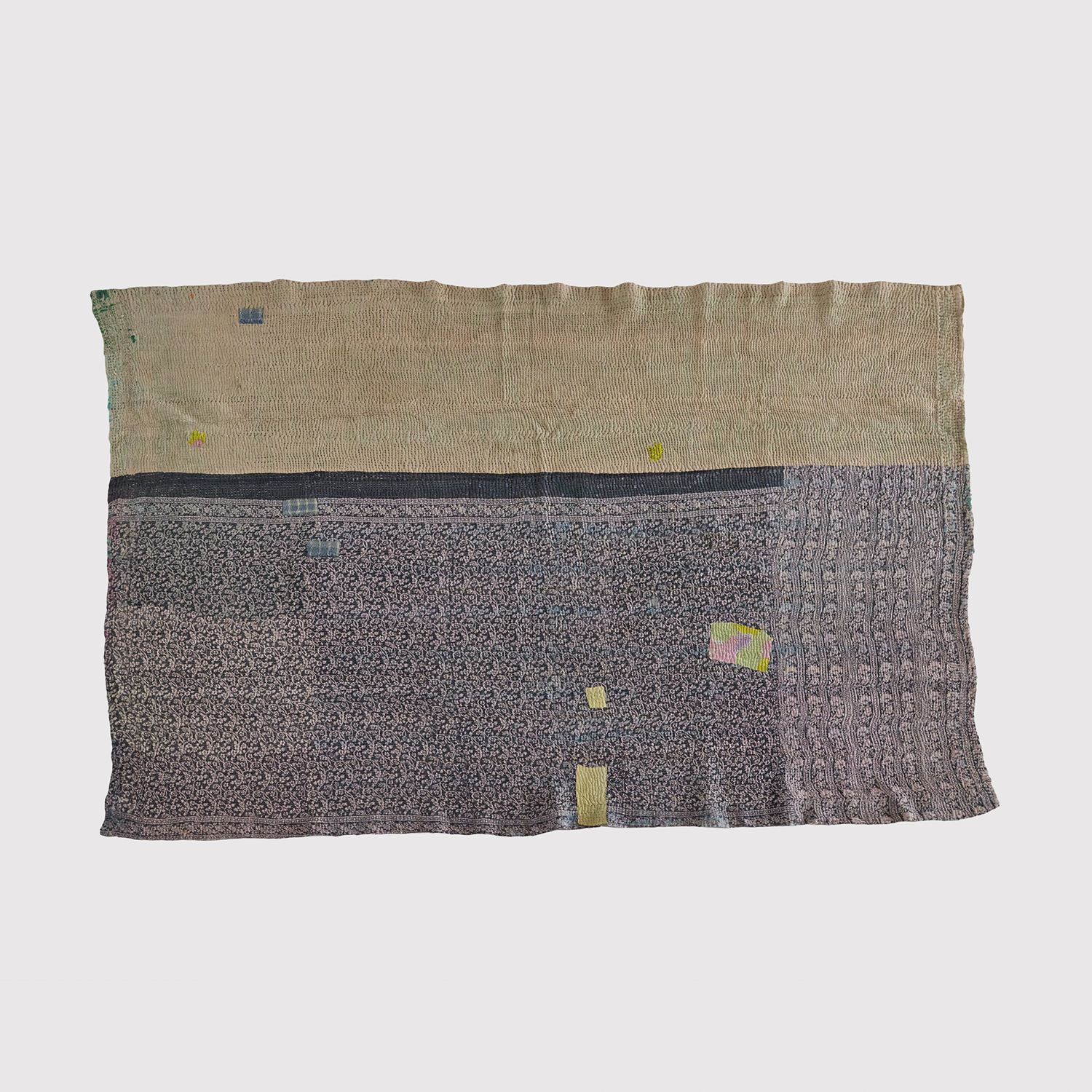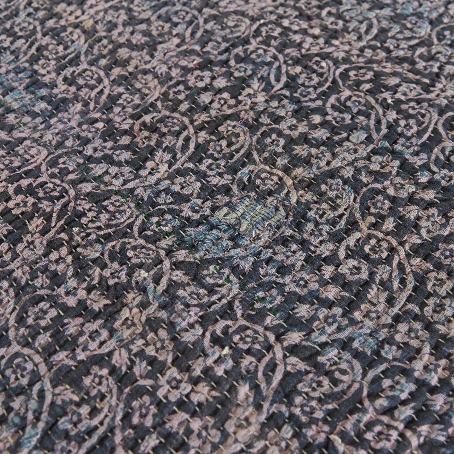 ラリー キルトは、インド・パキスタンなどの中東アジアで、永い間受け継がれてきた伝統的な布です。古くなったサリーやデュパタ、腰布・古いハギレ等を貼り合わせてパッチワークし、丁寧に刺し子で合わせたもの。インダス河流域の遊牧民の家々では、嫁入り道具として母親から娘へ受け継がれています。気の遠くなるような作業を経て、わが子へ想いをこめて手渡します。一枚一枚に物語があって、何千年にも渡り母から娘へと伝えられる品。布の貼り合わせ方、刺し子の細やかさ、生地の厚みや柄など1つとして同じものはありません。丁寧にハンドメイドで作られているからこその味わいと魅力があります。