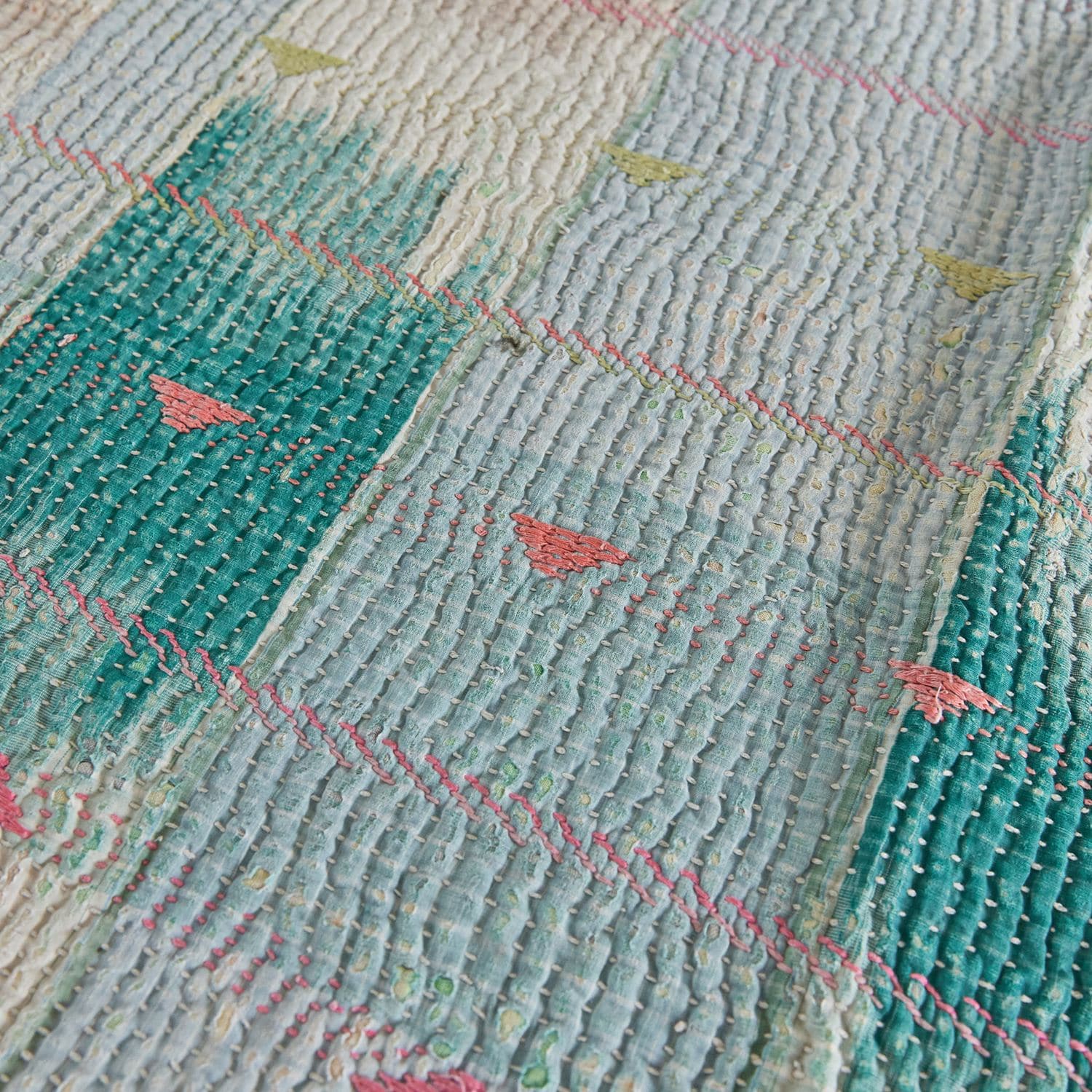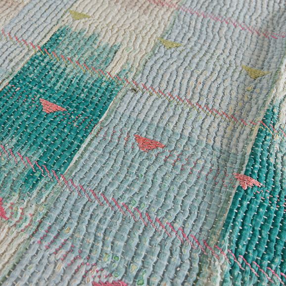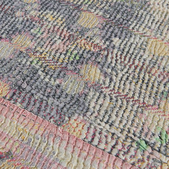 ラリー キルトは、インド・パキスタンなどの中東アジアで、永い間受け継がれてきた伝統的な布です。古くなったサリーやデュパタ、腰布・古いハギレ等を貼り合わせてパッチワークし、丁寧に刺し子で合わせたもの。インダス河流域の遊牧民の家々では、嫁入り道具として母親から娘へ受け継がれています。気の遠くなるような作業を経て、わが子へ想いをこめて手渡します。一枚一枚に物語があって、何千年にも渡り母から娘へと伝えられる品。布の貼り合わせ方、刺し子の細やかさ、生地の厚みや柄など1つとして同じものはありません。丁寧にハンドメイドで作られているからこその味わいと魅力があります。
