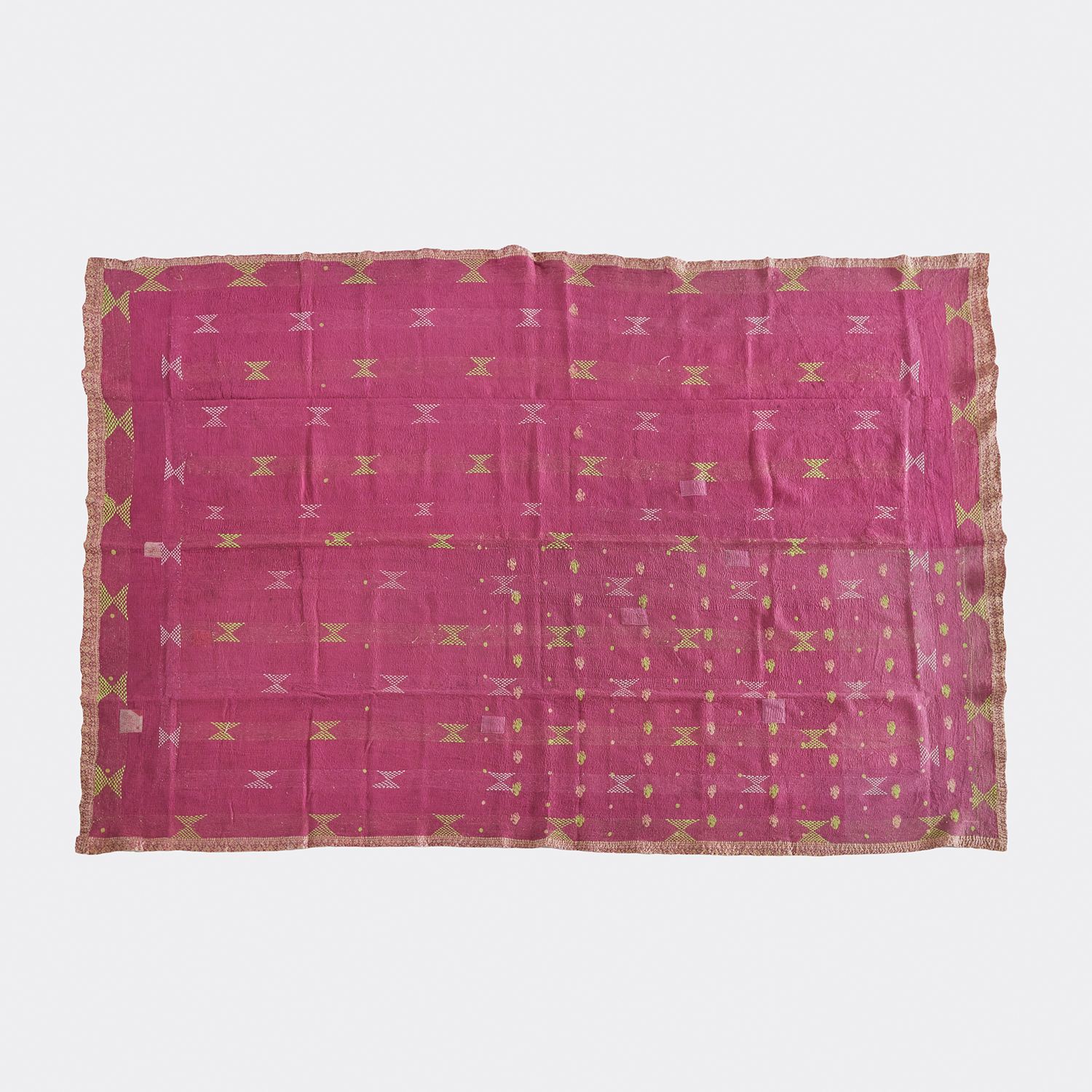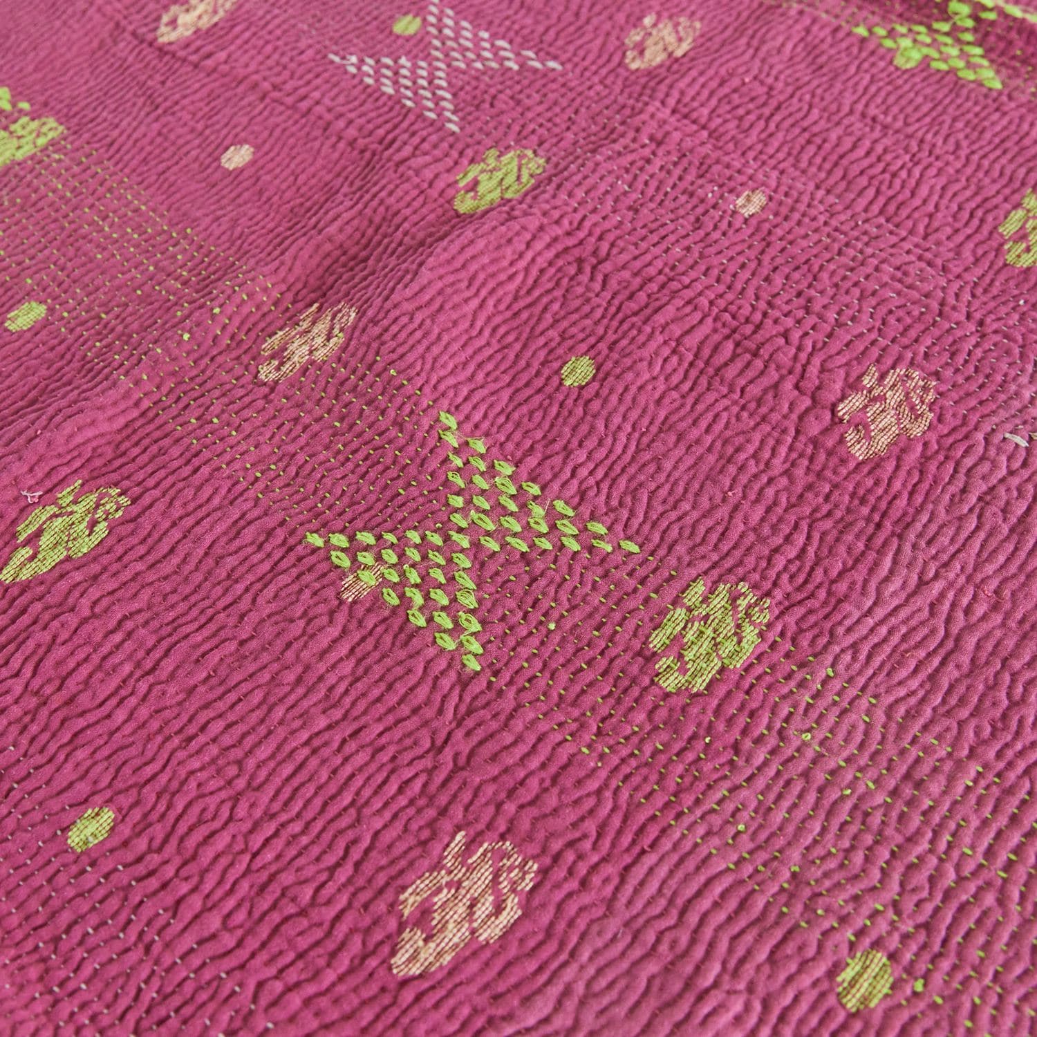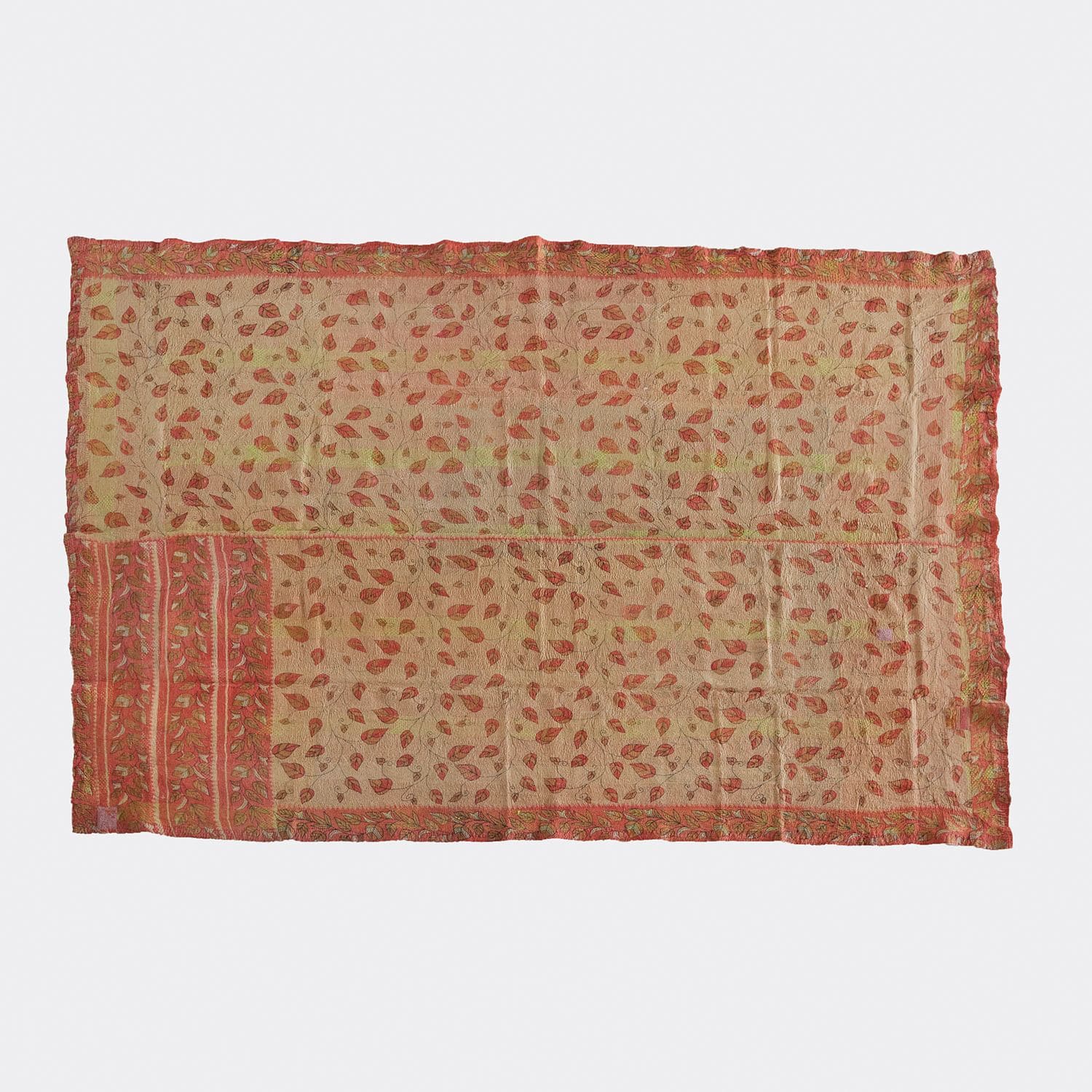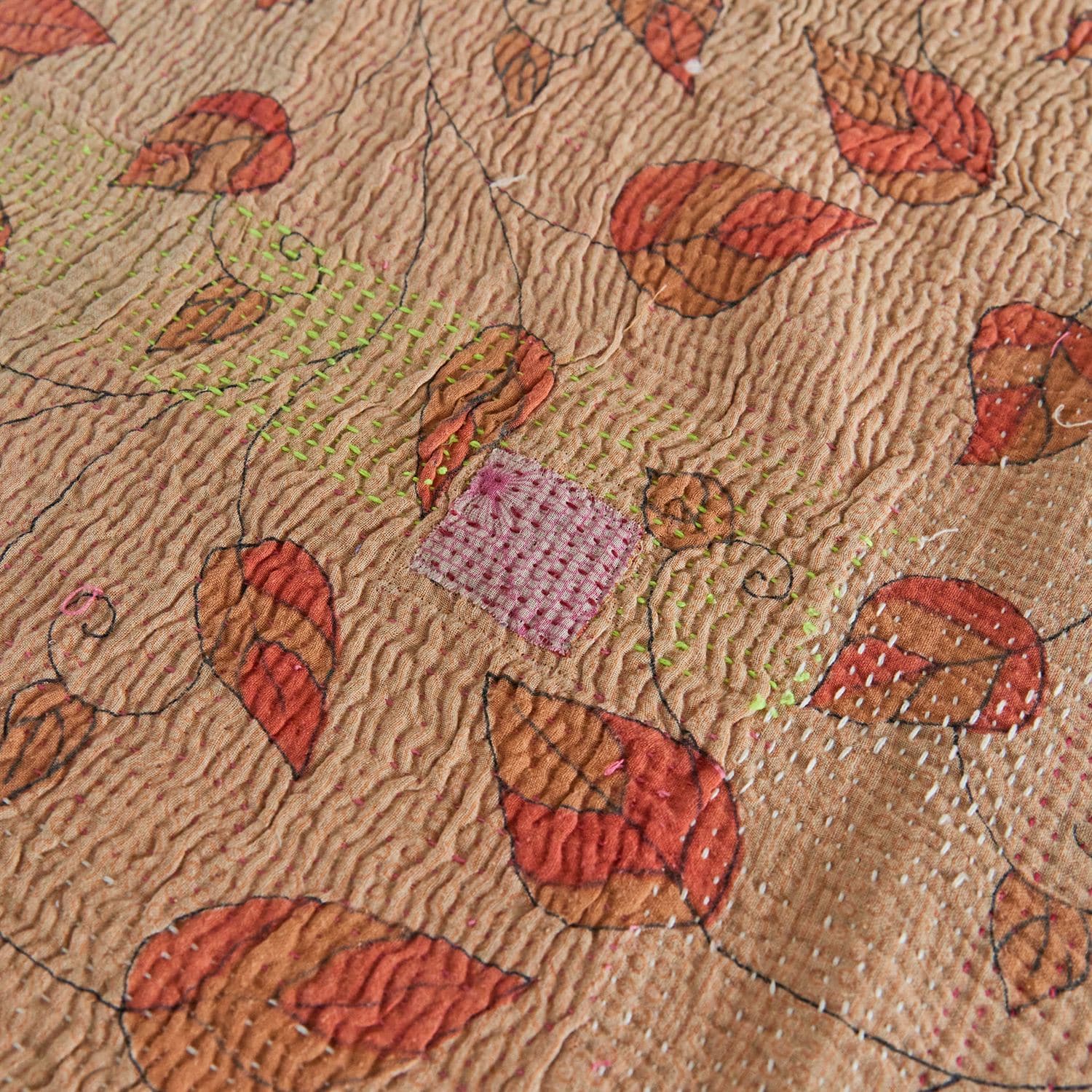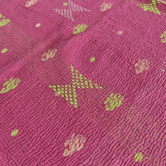 ラリー キルトは、インド・パキスタンなどの中東アジアで、永い間受け継がれてきた伝統的な布です。古くなったサリーやデュパタ、腰布・古いハギレ等を貼り合わせてパッチワークし、丁寧に刺し子で合わせたもの。インダス河流域の遊牧民の家々では、嫁入り道具として母親から娘へ受け継がれています。気の遠くなるような作業を経て、わが子へ想いをこめて手渡します。一枚一枚に物語があって、何千年にも渡り母から娘へと伝えられる品。布の貼り合わせ方、刺し子の細やかさ、生地の厚みや柄など1つとして同じものはありません。丁寧にハンドメイドで作られているからこその味わいと魅力があります。