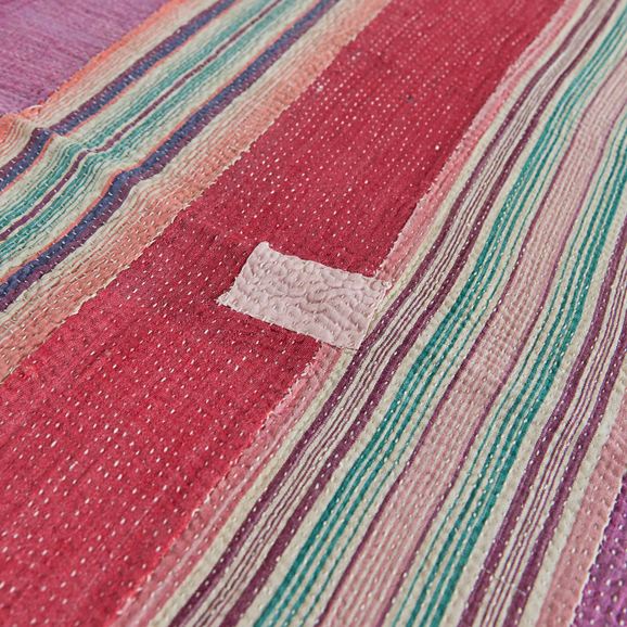 ラリー キルトは、インド・パキスタンなどの中東アジアで、永い間受け継がれてきた伝統的な布です。古くなったサリーやデュパタ、腰布・古いハギレ等を貼り合わせてパッチワークし、丁寧に刺し子で合わせたもの。インダス河流域の遊牧民の家々では、嫁入り道具として母親から娘へ受け継がれています。気の遠くなるような作業を経て、わが子へ想いをこめて手渡します。一枚一枚に物語があって、何千年にも渡り母から娘へと伝えられる品。布の貼り合わせ方、刺し子の細やかさ、生地の厚みや柄など1つとして同じものはありません。丁寧にハンドメイドで作られているからこその味わいと魅力があります。