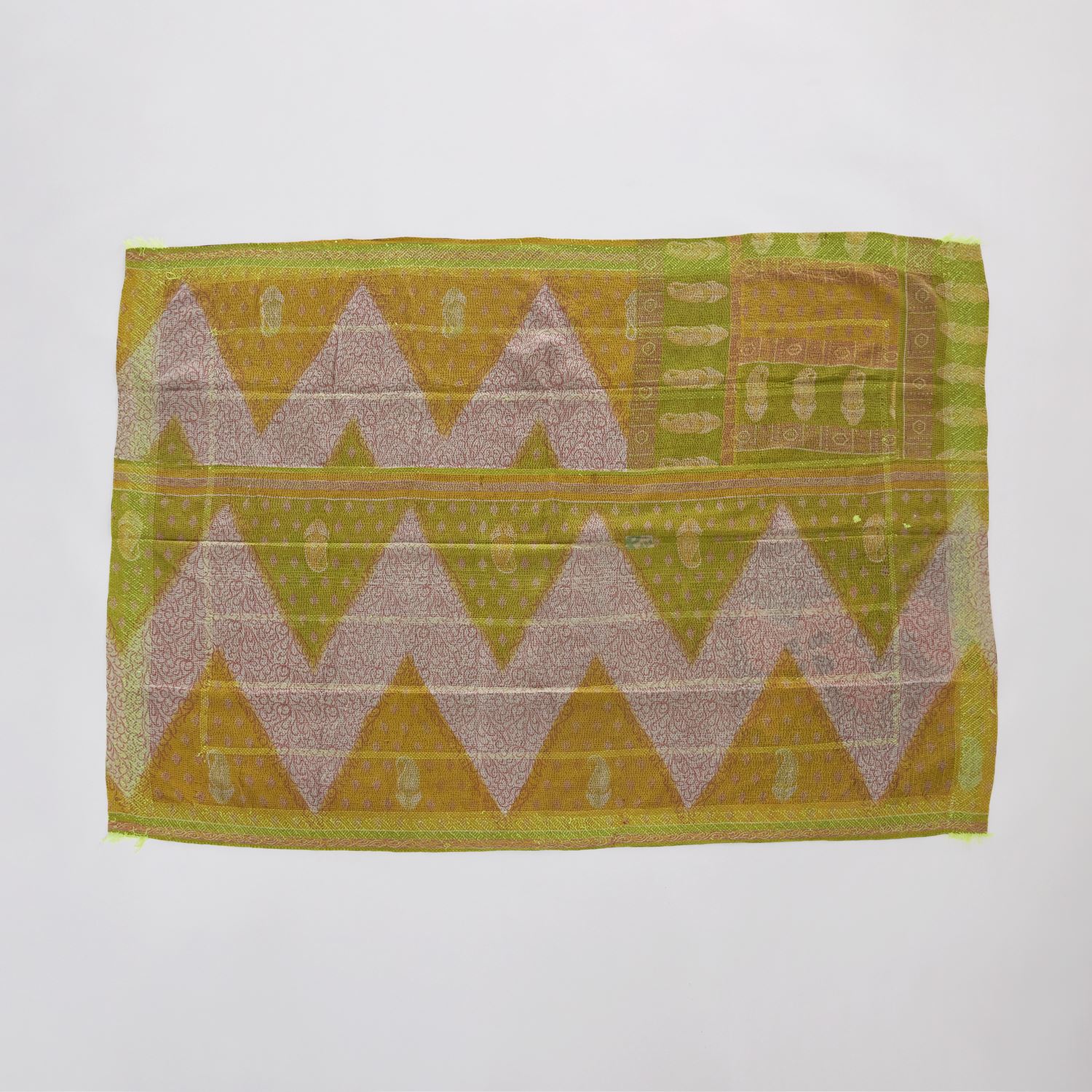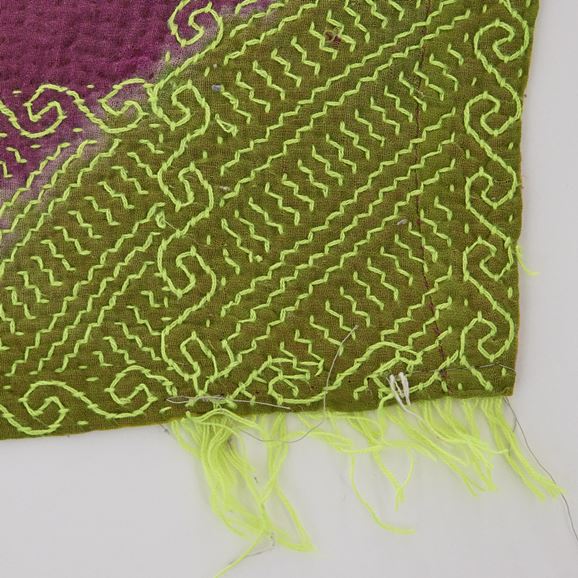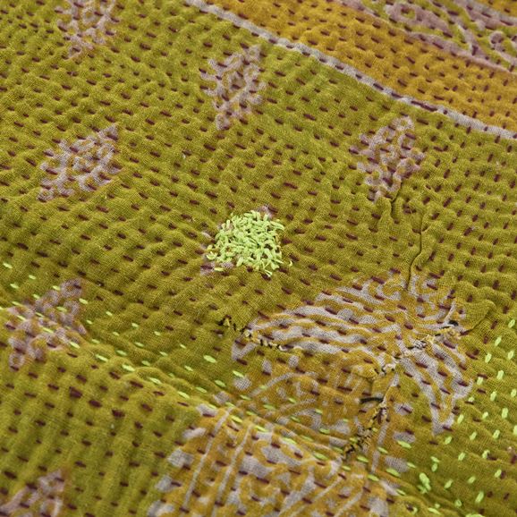 ラリー キルトは、インド・パキスタンなどの中東アジアで、永い間受け継がれてきた伝統的な布です。古くなったサリーやデュパタ、腰布・古いハギレ等を貼り合わせてパッチワークし、丁寧に刺し子で合わせたもの。インダス河流域の遊牧民の家々では、嫁入り道具として母親から娘へ受け継がれています。気の遠くなるような作業を経て、わが子へ想いをこめて手渡します。一枚一枚に物語があって、何千年にも渡り母から娘へと伝えられる品。布の貼り合わせ方、刺し子の細やかさ、生地の厚みや柄など1つとして同じものはありません。丁寧にハンドメイドで作られているからこその味わいと魅力があります。