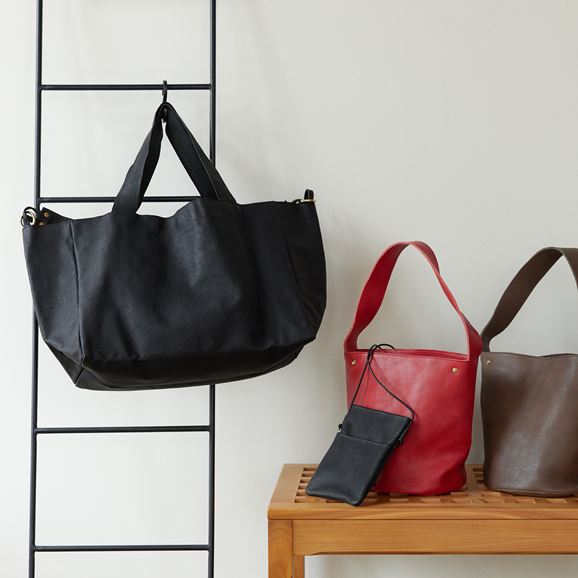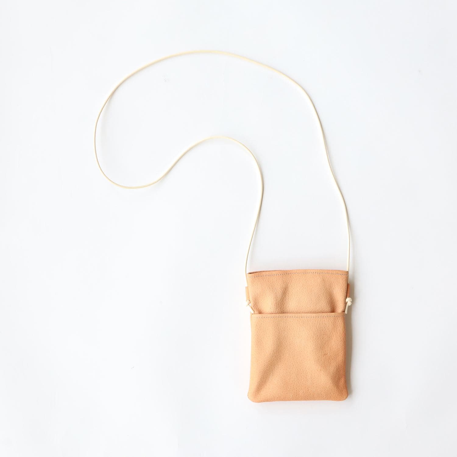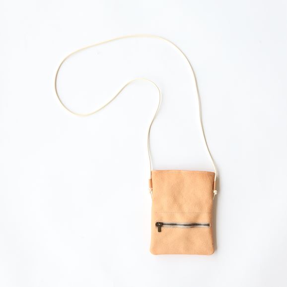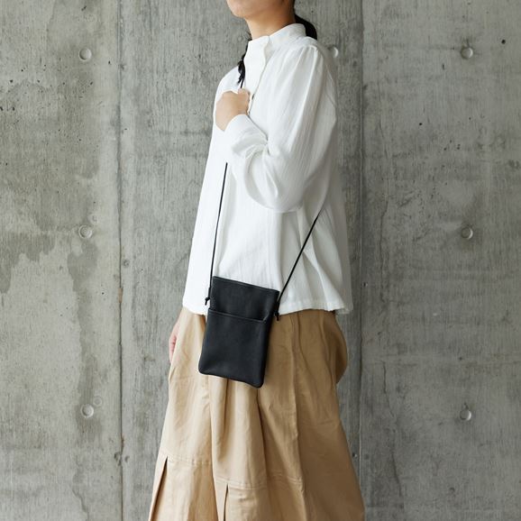 大きめのスマホもしっかり入るサイズ感で、身につけておきたい小物がサッと取り出せるようマグネットなどの「留め」を敢えて排除したシンプルな型です。フロントのポケットや背面のファスナーポケットは小さいながらも役立ちます。ストラップの紐はお好きな位置に結ぶだけでショルダーや斜めがけなど自由自在にお使いいただけます。