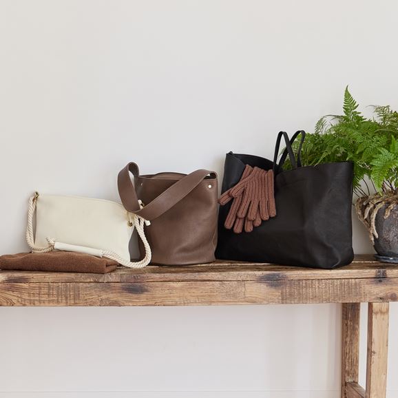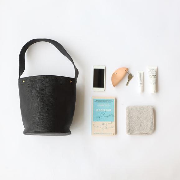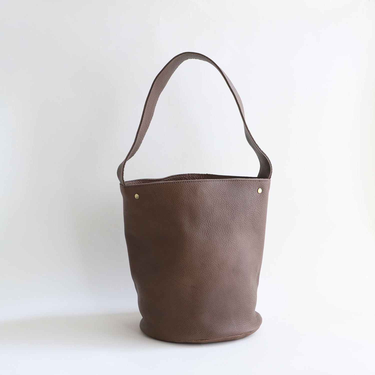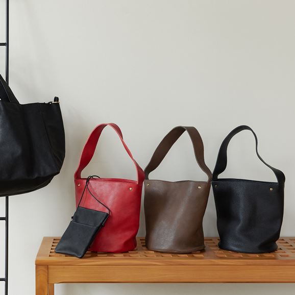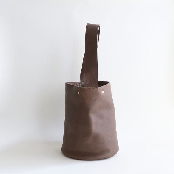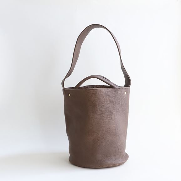 エコレザーを中心に、自社のアトリエで一つひとつ手作業で製作されるsonor(ソナー)のバッグ。こちらはシンプルで使いやすいバッグ底が丸型となったバケツ型のバッグです。タンニン鞣しの姫路牛革を使用ししっとりとした上質な質感です。お財布やスマートフォンなどの貴重品の他にポーチやお弁当なども入れられ、実用的で普段使いにおすすめのサイズです。肩掛けと手持ちができる2way仕様です。肩掛けできる程よい長さのショルダーストラップは幅広デザインのため肩に優しくフィットし荷物が多いときでも安心。ハンドルは内側に収納できるので、ショルダーバッグとして使用するときや、荷物を出し入れするときに邪魔にならず、スムーズな使い心地です。