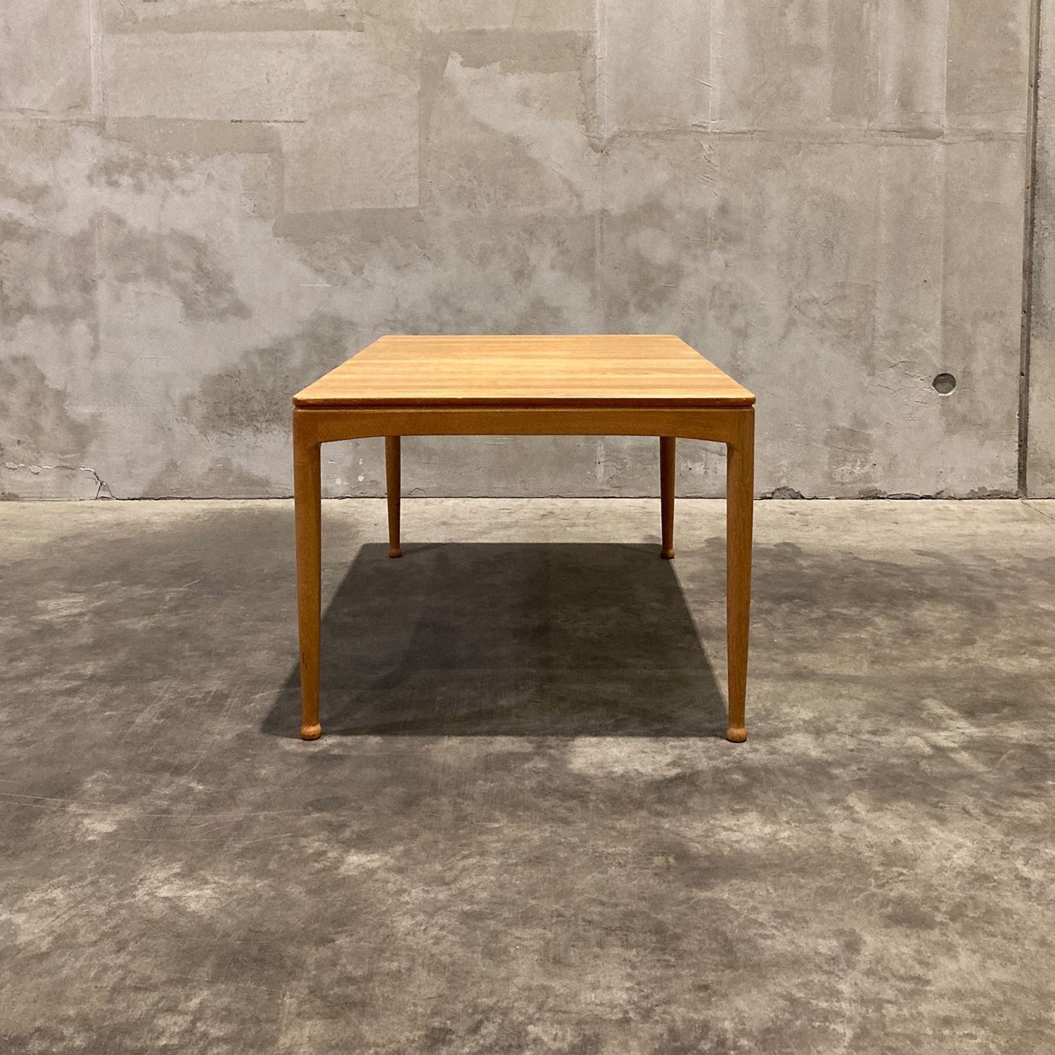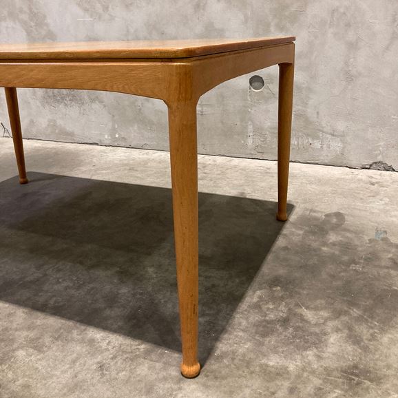 1960年代のスウェーデンで製造されたオーク材を使用したローテーブルです。ミッドセンチュリー北欧デザインの美点である「細やかな職人技」と「控えめで上質な佇まい」がしっかりと息づく一台です。北欧らしい端正なシルエットで、直線的なフレームに、角をわずかに丸めた柔らかなラインが加わり、ミニマルでありながら上質な雰囲気を纏っています。オーク材の豊かな天板が天然オークならではの明るくナチュラルな木肌が、空間に温かみをもたらします。経年によりさらに美しく育つ素材です。テーパードレッグ(先細りの脚)は、1960年代スウェーデン家具に多く見られる細身の脚部です。軽快で浮遊感のある印象を与え、圧迫感なく空間に馴染みます。丁寧な面取り加工も特徴的で、
