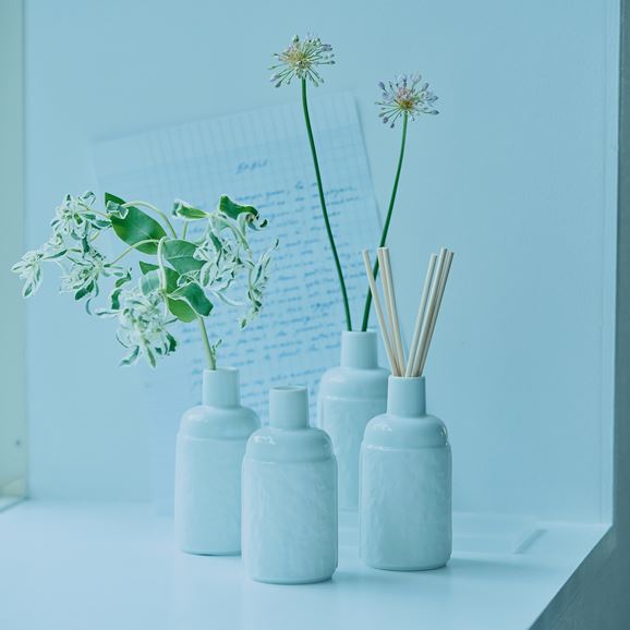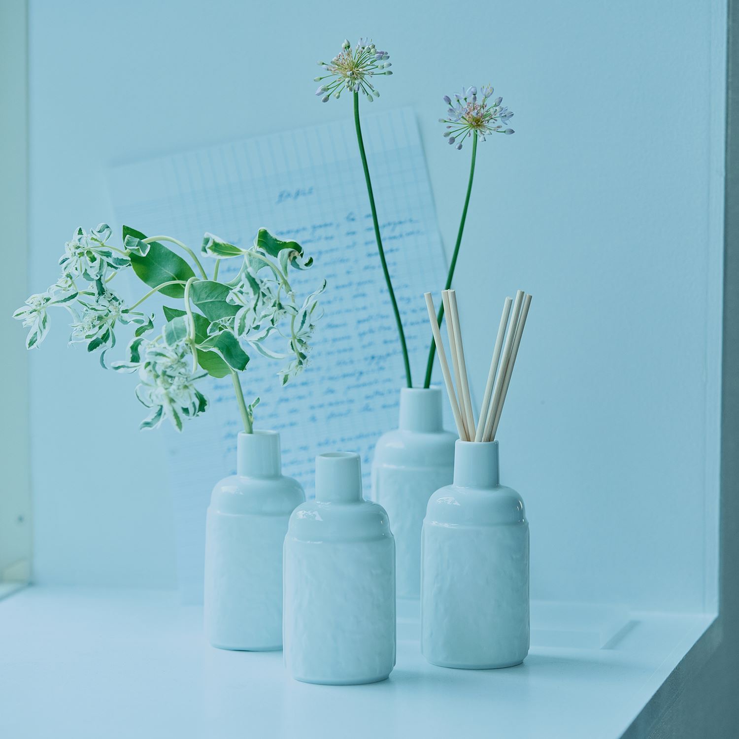 光沢とマットの質、なめらかな曲線とフリーハンドの凹凸、相反する要素の ”ensemble” です。シンプルながらもぬくもりを感じる佇まい。ディフューザーボトルとして使用しない際は花器として使っても◎。