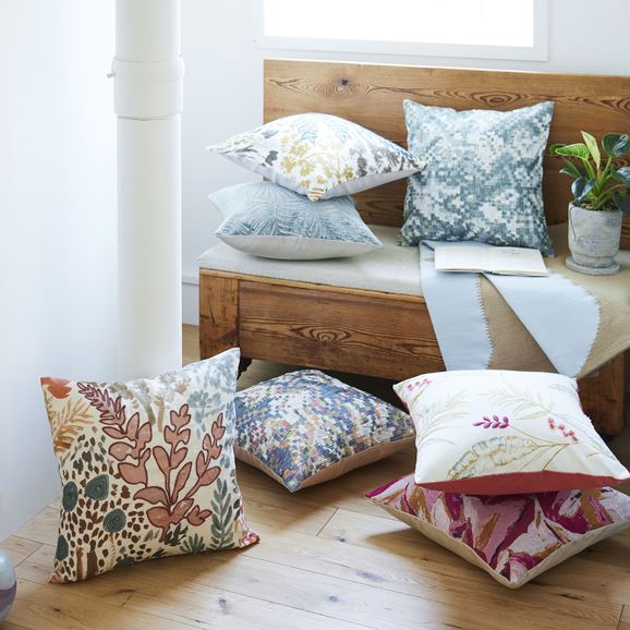 フランスのテキスタイルブランド「CAMENGO」の生地を使ったクッションカバー。「CAMENGO」は、暮らしの中で色を組み合わせることの楽しさや、色空間で過ごす心地よさ、素材とテクスチャーが生み出す光を愉しめ、優雅な気分をあたえてくれる人気のブランドです。