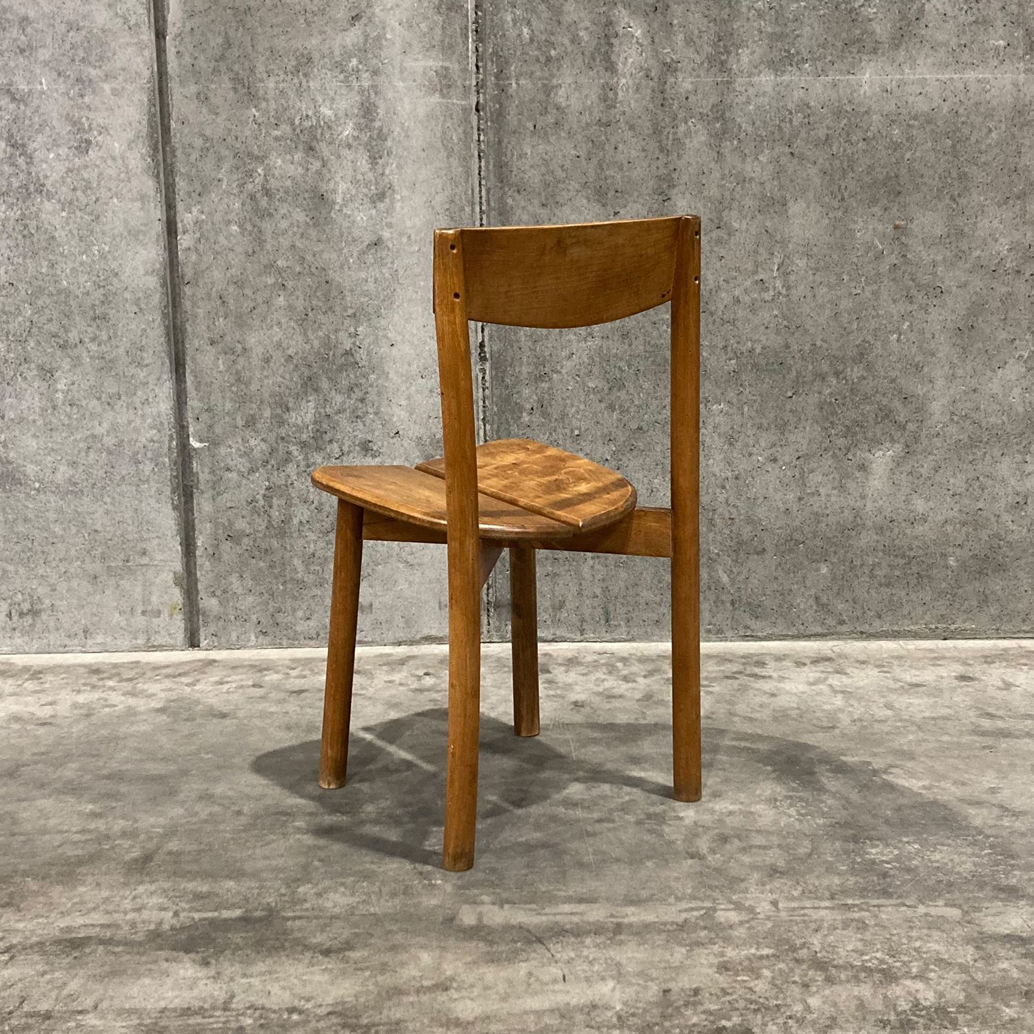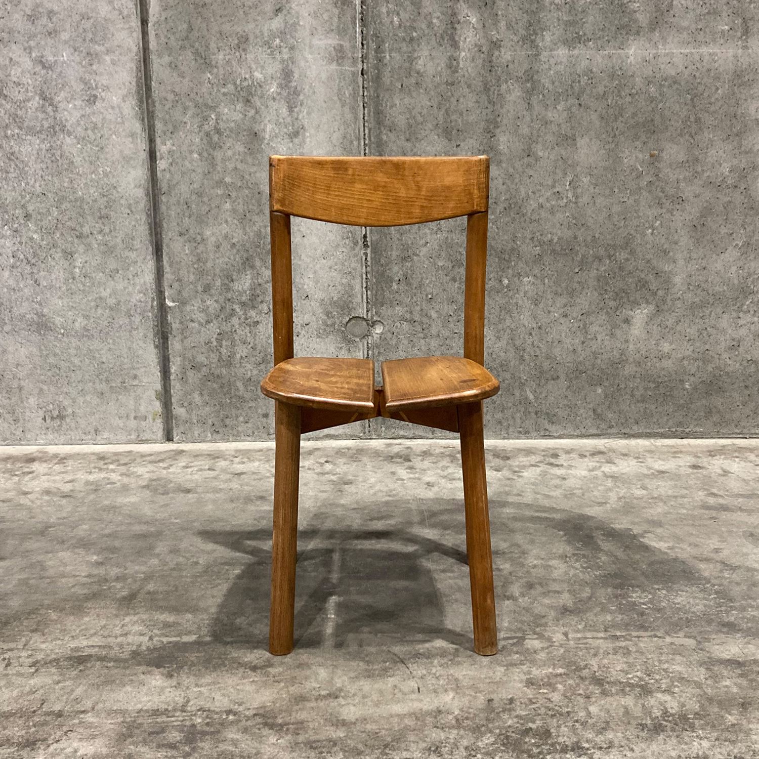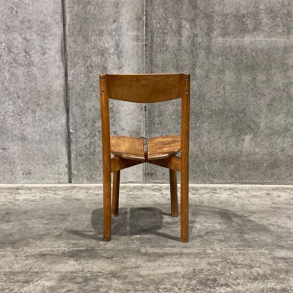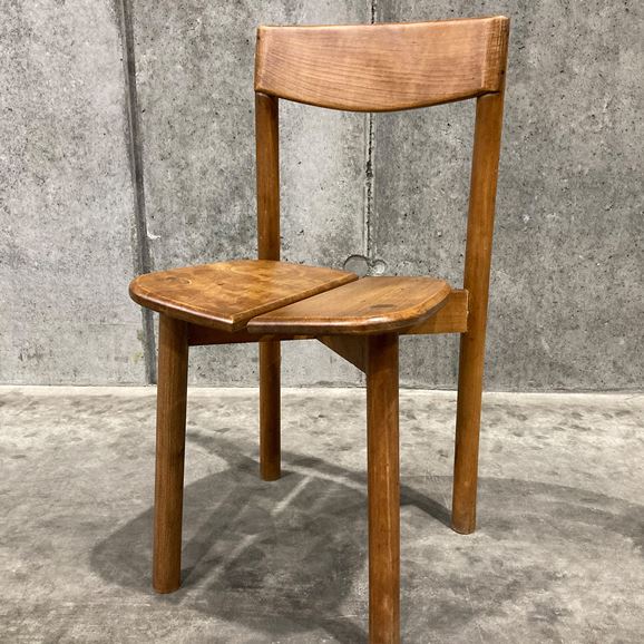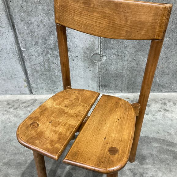 イデーのオリジナル家具と親和性があり、現代の日本のライフスタイルに馴染むヴィンテージアイテムを、バイヤーが1点1点セレクトしました。<br><br> フランスで製作されたビーチ材のチェアです。牧歌的なイメージのデザインで、素朴なたたずまいが魅力で日常遣いができるチェアです。ビーチ材特有の緻密でしっとりとした滑らかな木肌と、強度を活かした魅力的な一脚です。座面のデザインが特徴的で、座りやすさを考慮し二枚の板座が中央に向けて斜めにデザインされています。ダイニングチェアとしておすすめです。 <h5 class="mt40">ヴィンテージ家具の全ラインナップはこちら</h5><a href="/shop/c/cV0-all/"><img src="/images/item_page_banner/itemPage_bnr_onl_vintage.jpg" alt="【特集】ヴィンテージ家具" class="itempagebnr"></a>