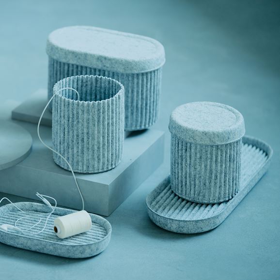 イデーオリジナルの収納アイテム、Saza Series(サザ シリーズ)。さざなみのようなフェルトの凹凸がデザインアクセントのボックスとトレーです。