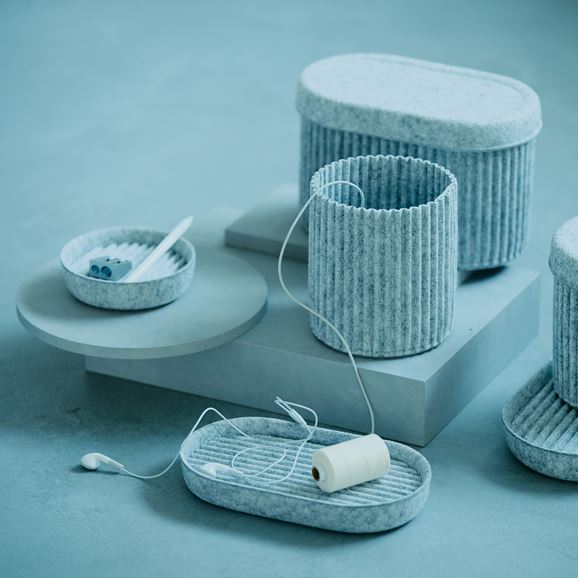 イデーオリジナルの収納アイテム、Saza Series(サザ シリーズ)。さざなみのようなフェルトの凹凸がデザインアクセントのボックスとトレーです。