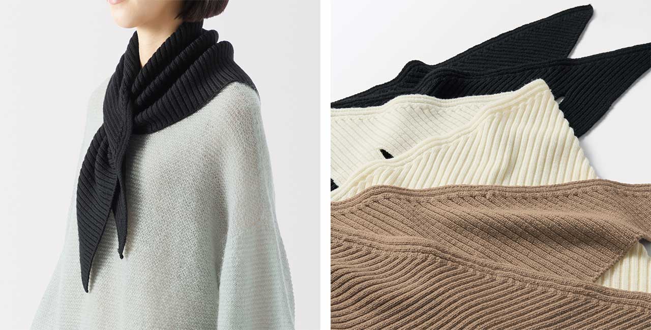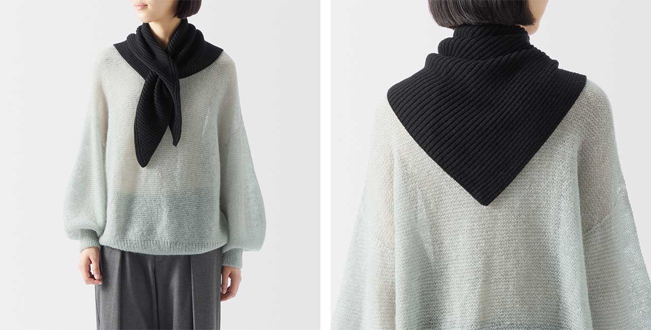 イデーのウェアシリーズ H& by POOL(ハンド バイ プール)の三角型のリブ編みスカーフ。