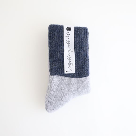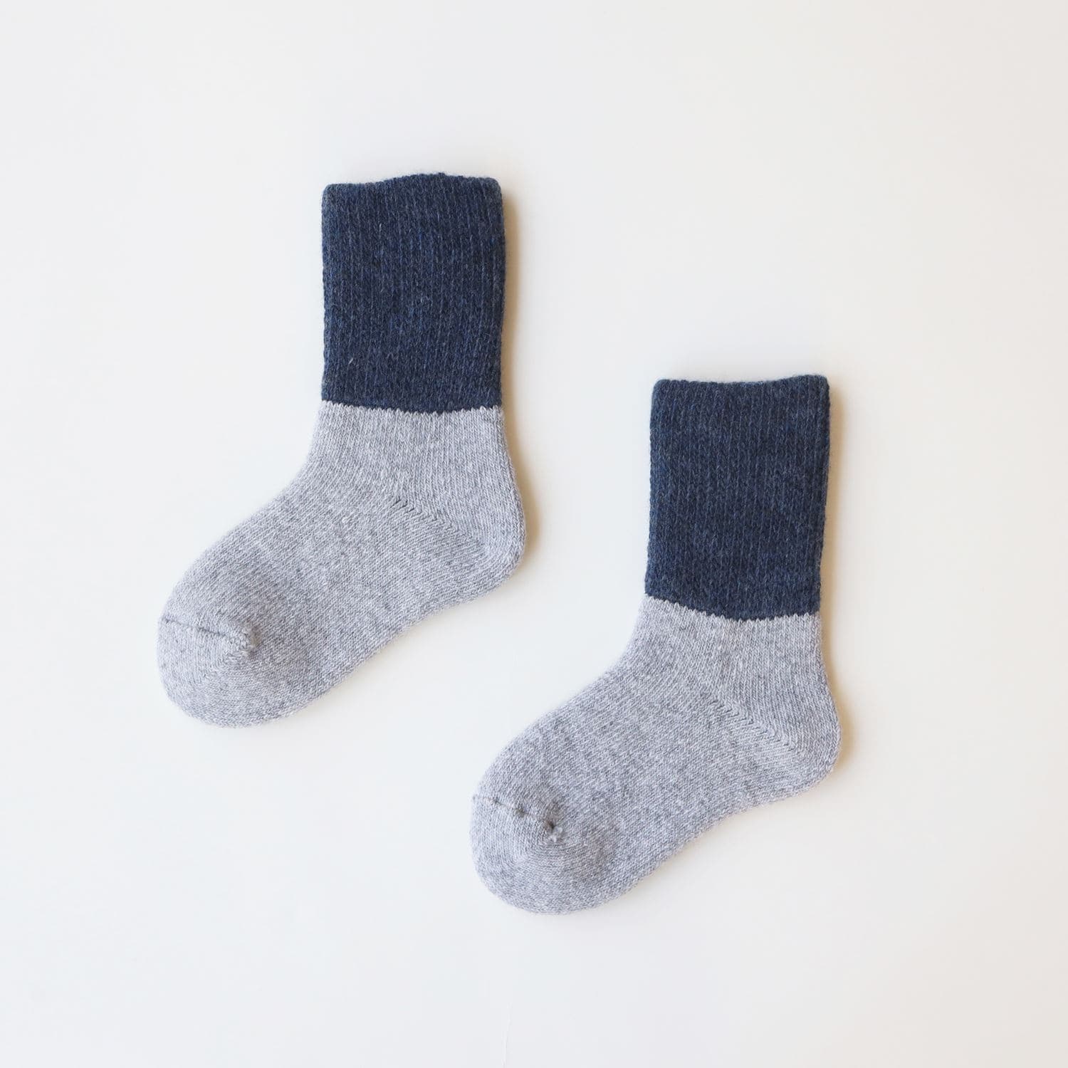 産地で余った残糸を無駄にせず、一部リユースして仕立てたソックス。肉厚で柔らかな履き心地が特長で、床からの冷えを防ぎ、足元を心地よく温めてくれます。落ち着いた2トーンのカラーは、シンプルながらも程よい存在感があり、日常に寄り添う一足です。