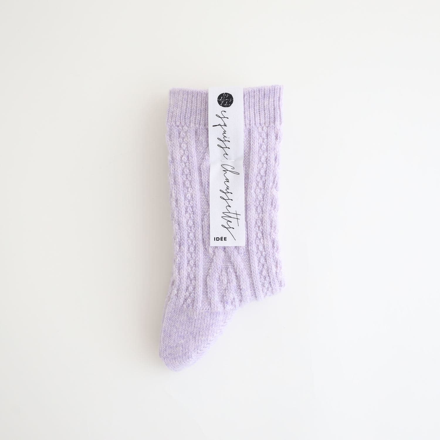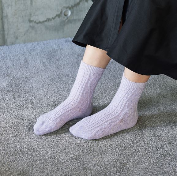 産地の残糸を廃棄せず一部リユースして作ったソックスです。ケーブル模様が温かみのある雰囲気で、秋冬にぴったりのソックスです。装いに合わせやすい4色をそろえました。