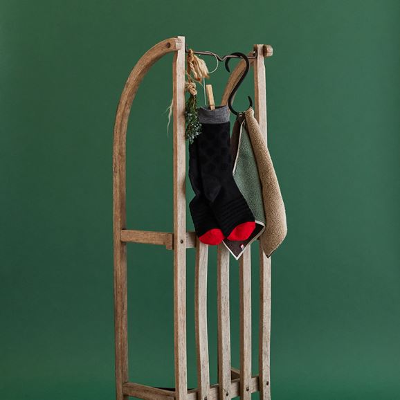 凹凸感のあるストライプとドットがさりげなく浮かび上がる、イデーのオリジナルソックス。立体的な模様が足元に表情を添え、ブラックに映えるつま先のカラーがアクセントとなっています。