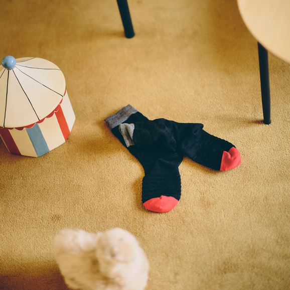 凹凸感のあるストライプとドットがさりげなく浮かび上がる、イデーのオリジナルソックス。立体的な模様が足元に表情を添え、ブラックに映えるつま先のカラーがアクセントとなっています。