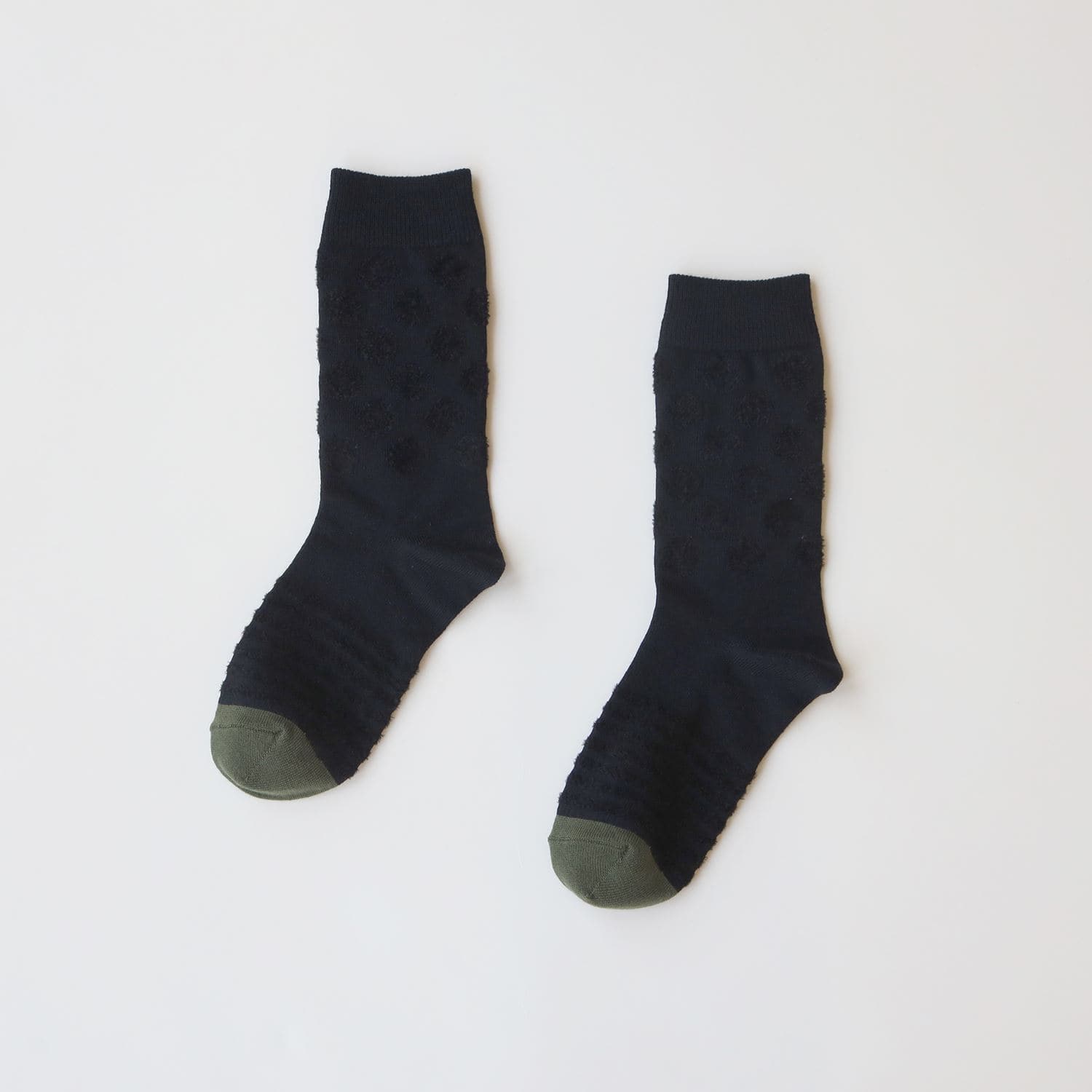 凹凸感のあるストライプとドットがさりげなく浮かび上がる、イデーのオリジナルソックス。立体的な模様が足元に表情を添え、ブラックに映えるつま先のカラーがアクセントとなっています。