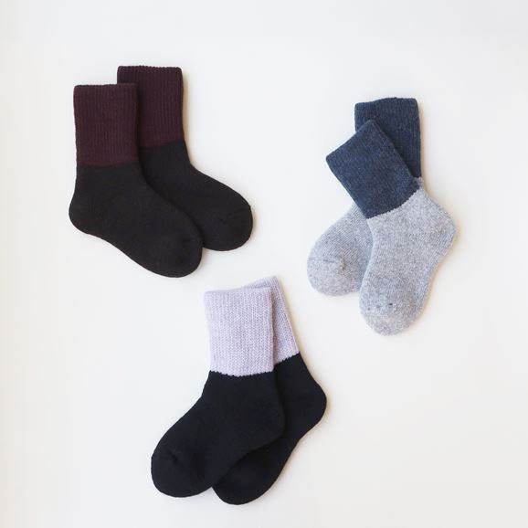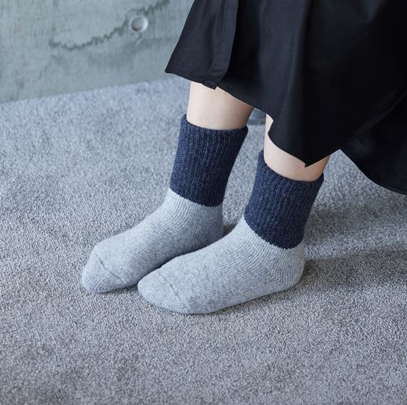 産地で余った残糸を無駄にせず、一部リユースして仕立てたソックス。肉厚で柔らかな履き心地が特長で、床からの冷えを防ぎ、足元を心地よく温めてくれます。落ち着いた2トーンのカラーは、シンプルながらも程よい存在感があり、日常に寄り添う一足です。