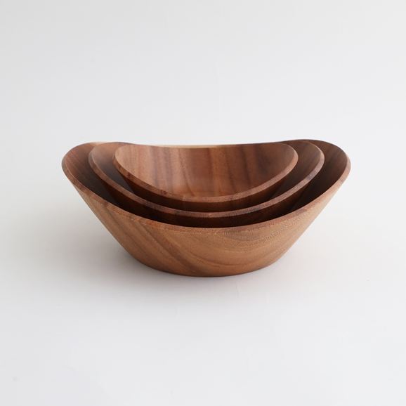あたたかみのあるアカシアの木目が料理をやさしく引き立てます。小さいサイズは取り皿に。M・Lサイズはサラダ、パンなどさまざまな料理に使いやすく、食卓に自然と馴染みます。