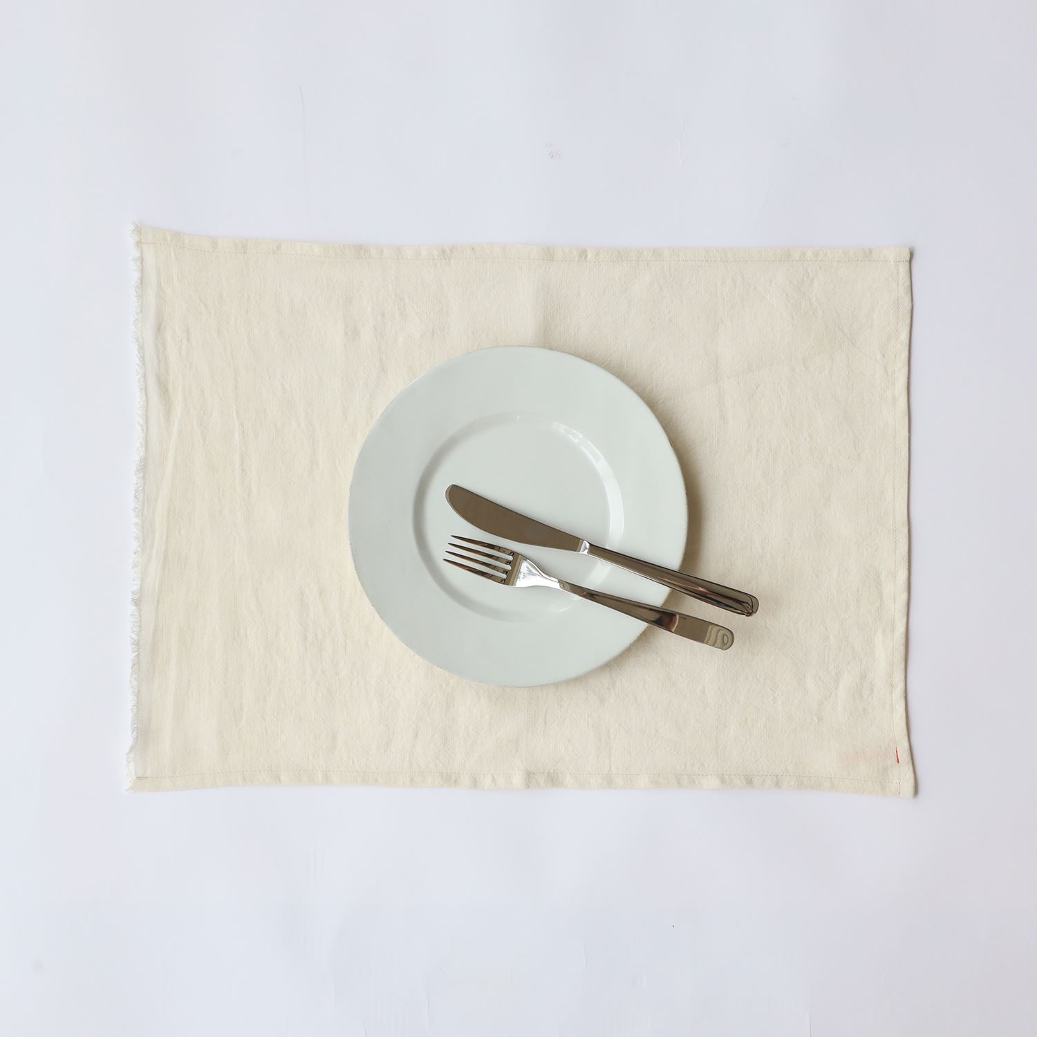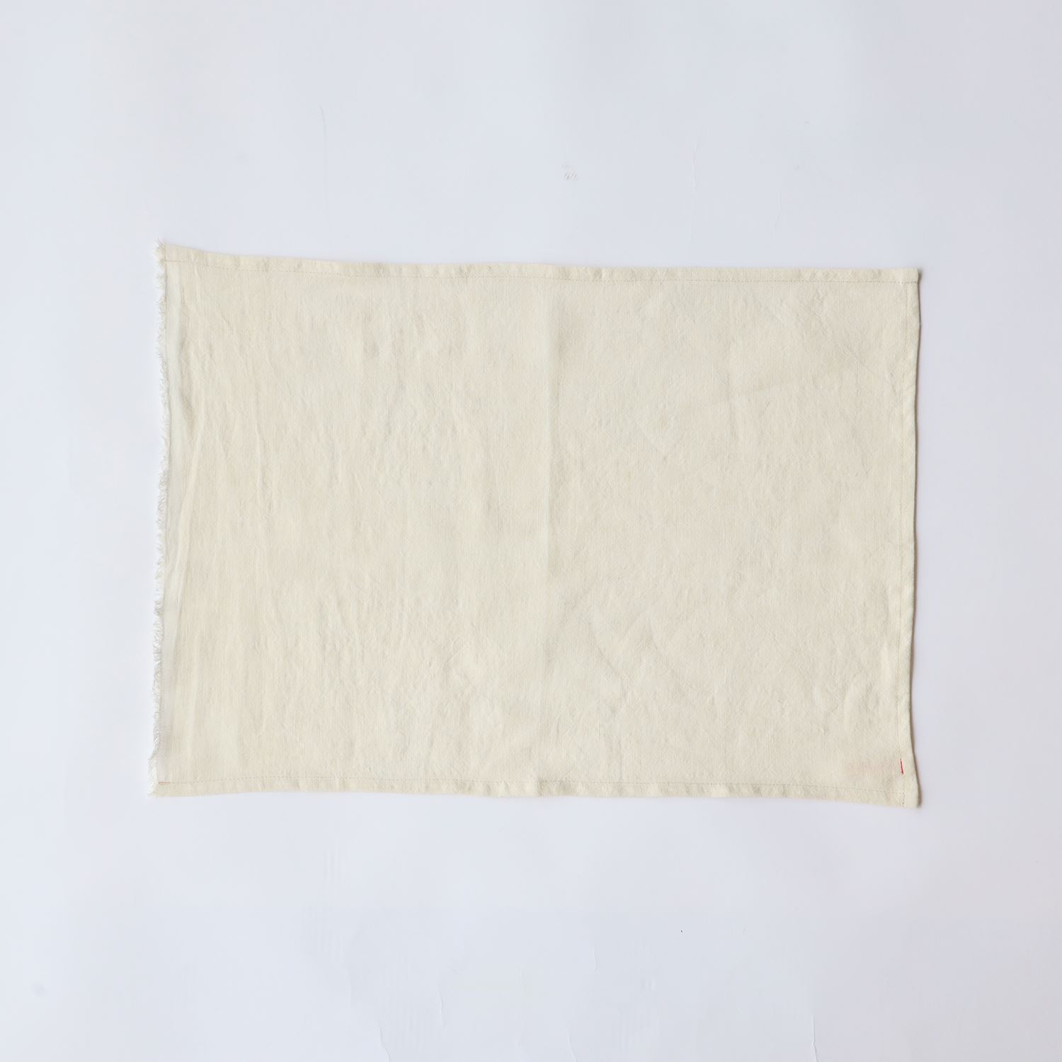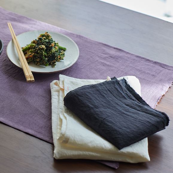 リネン100%の生地を使用し、洗いのかかった柔らかな風合いのプレイスマットとキッチンクロスです。普段は隠れてしまう織り耳を生かしシンプルな中にさりげない表情をもたせました。使うほどになじみ、リネンらしい風合いが深まり日常にやさしく寄り添います。
