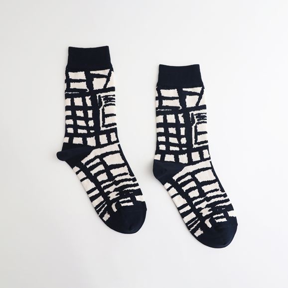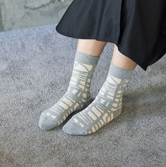 こちらは、行き場をなくした糸を使用して編んだソックスです。デザインは鹿児島にある知的障害者支援施設「しょうぶ学園」のアーティストが描いた図柄をプリントしました。日々の活動の中で、自由で力強い作品を生み出しています。