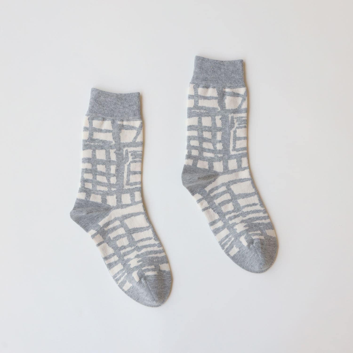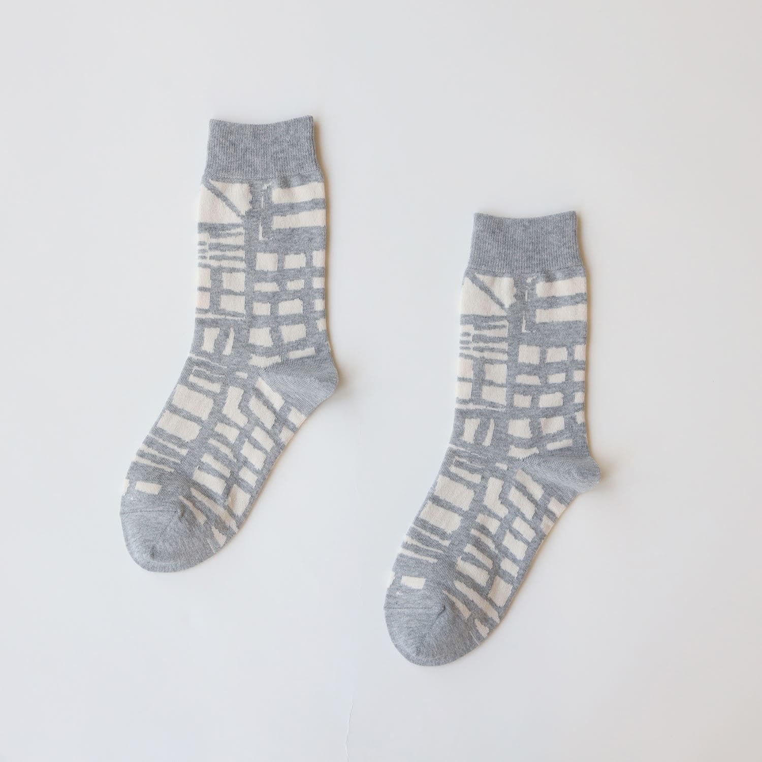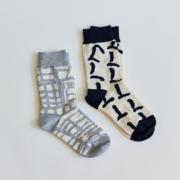 こちらは、行き場をなくした糸を使用して編んだソックスです。デザインは鹿児島にある知的障害者支援施設「しょうぶ学園」のアーティストが描いた図柄をプリントしました。日々の活動の中で、自由で力強い作品を生み出しています。