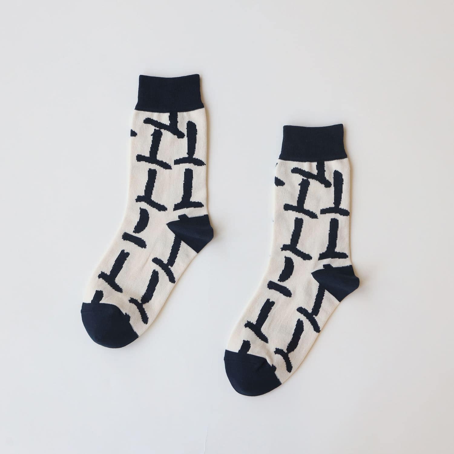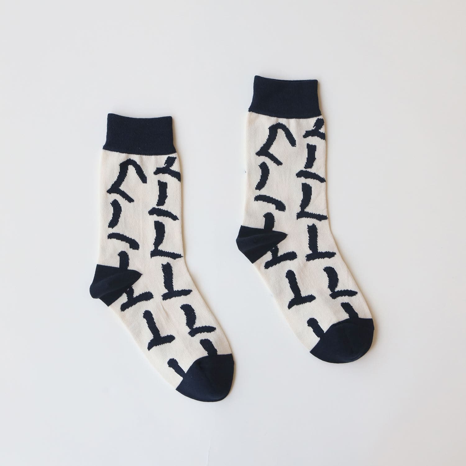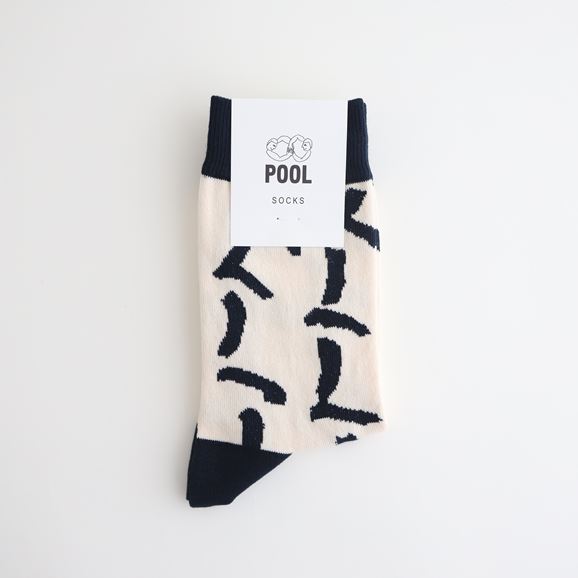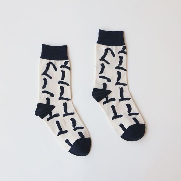 こちらは、行き場をなくした糸を使用して編んだソックスです。デザインは鹿児島にある知的障害者支援施設「しょうぶ学園」のアーティストが描いた図柄をプリントしました。日々の活動の中で、自由で力強い作品を生み出しています。