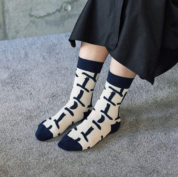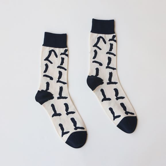 こちらは、行き場をなくした糸を使用して編んだソックスです。デザインは鹿児島にある知的障害者支援施設「しょうぶ学園」のアーティストが描いた図柄をプリントしました。日々の活動の中で、自由で力強い作品を生み出しています。