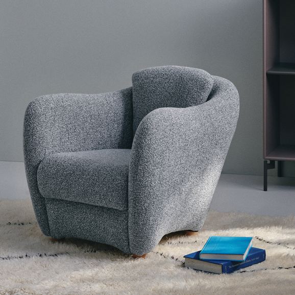 ころんとした有機的なフォルムが人気のMINI MILLER ARM CHAIR 。すっぽりと包み込まれるような感覚と床に近い低めのシートで、想像以上にゆったりとくつろげる座り心地です。カラーはグレー、ブラック、ブルー、アイボリーの4色からお部屋の雰囲気に合わせてお選びいただけます。やわらかな肌触りと上品な表情が魅力のブークレ生地が、丸みのあるシルエットを引き立てます。