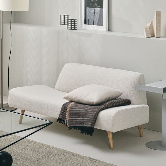 表面にループ状の糸を用いた立体的な質感が特徴のブークレ生地を使用しています。やわらかく温かみがあり、やさしい印象を与えます。本製品ではほどよい凹凸感の生地を選定しているため、季節を問わず快適にお使いいただけます。