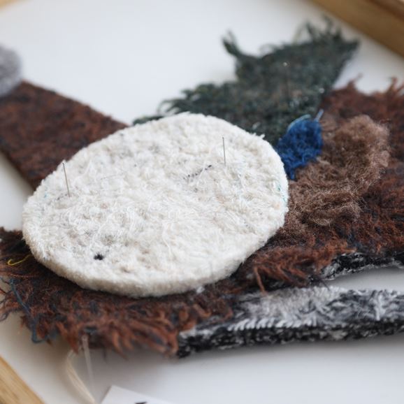 植物園の隣にあるアトリエで樹木や池を借景にしながら、鳥のさえずりをBGMに制作される架空の鳥たちのコレクションです。四季を通じて訪れるさまざまな鳥たちが創作のインスピレーションになっています。作品は、獣毛生地の端材をニードルパンチで形づくるところから始まります。ある日アトリエの床に落ちた小さな端材が偶然鳥のかたちに見えたことがきっかけで、このシリーズが誕生しました。丸い端材は卵のように、糸屑の集まりは巣のようにも見え、素材のかたちが物語を生み出します。
