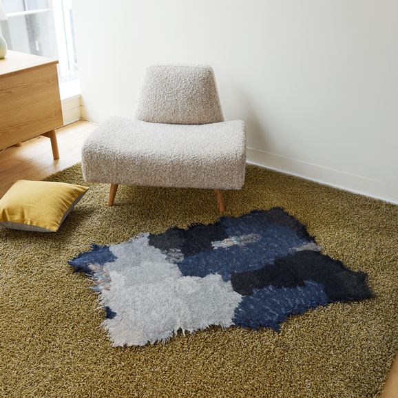 テキスタイル工場から出る獣毛生地の端材を、ニードルパンチ技法によってフェルト化し、新たな毛物(獣)を制作しました。ラグとしてお使いいただく際は、商品に付属している注意書きをご確認ください。作品は、全て一点モノです。